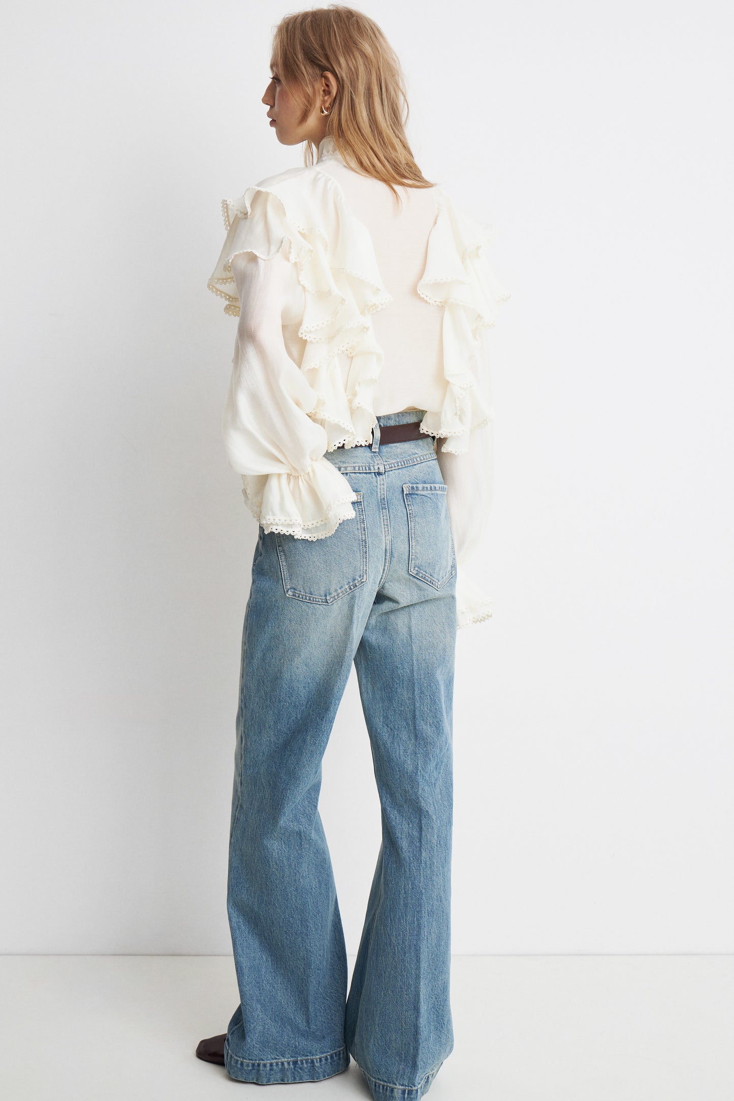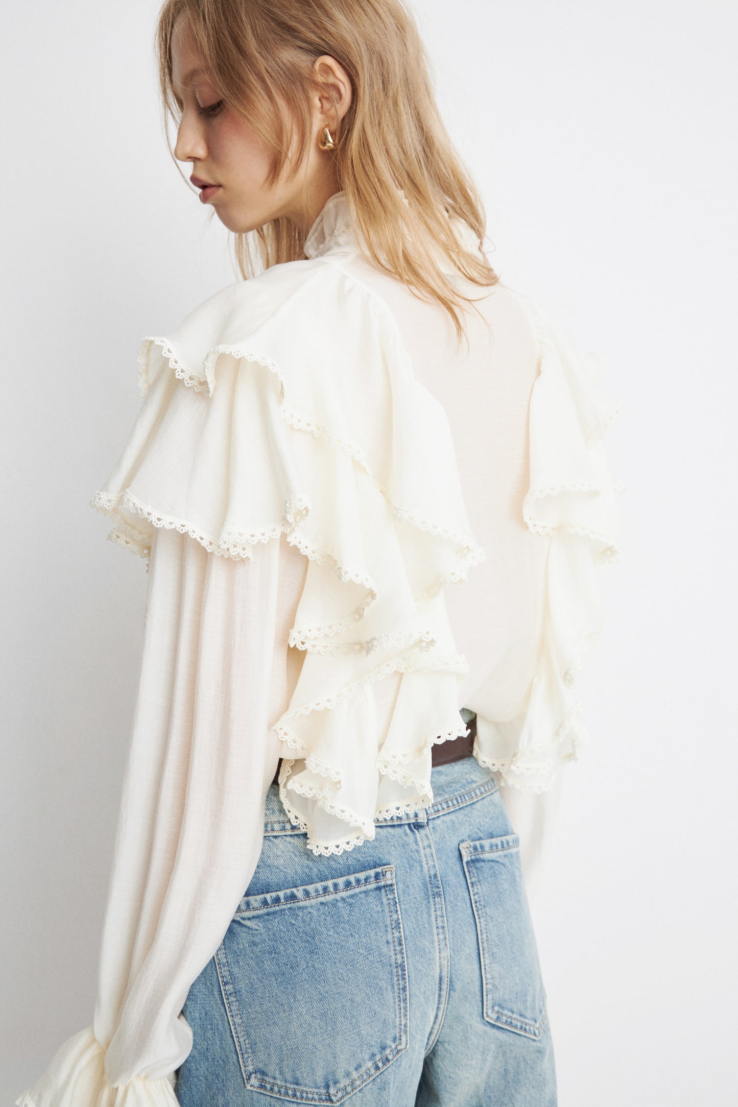 Loose-fit blouse in an airy lyocell blend with ruffles and lace insert. Ruffled collar features narrow ties. Long sleeves with ruffle-trimmed, elasticized cuffs. Covered buttons at front.