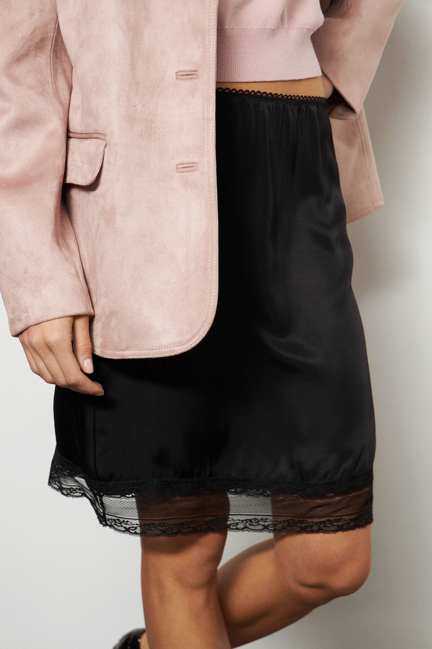 Mini skit in a satin viscose fabric and matching tone lace. Concealed in-seam zip closure.