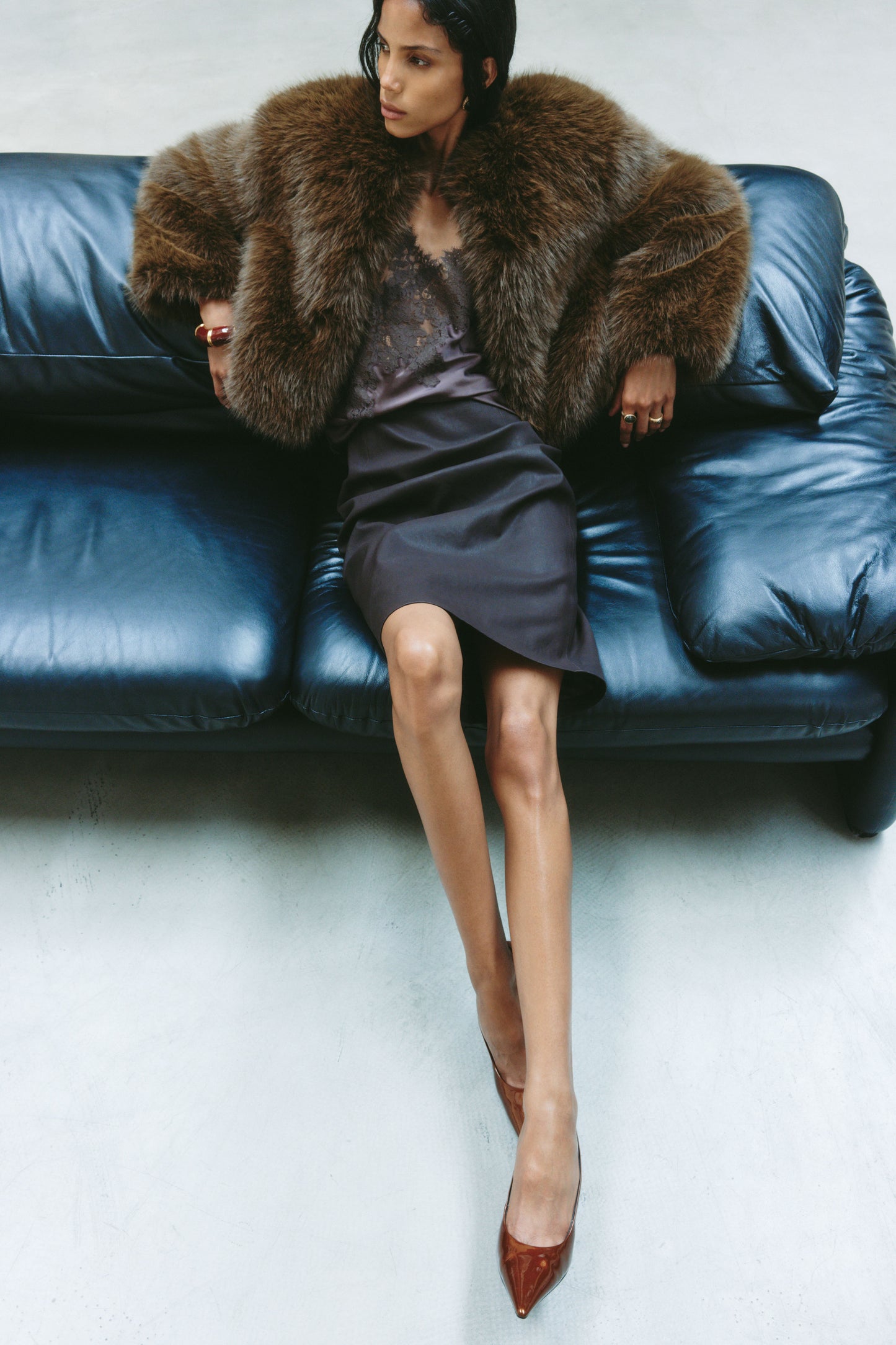 Sleeveless top in softly draped satin and lace. V-shaped neckline and adjustable shoulder straps for a defined silhouette.