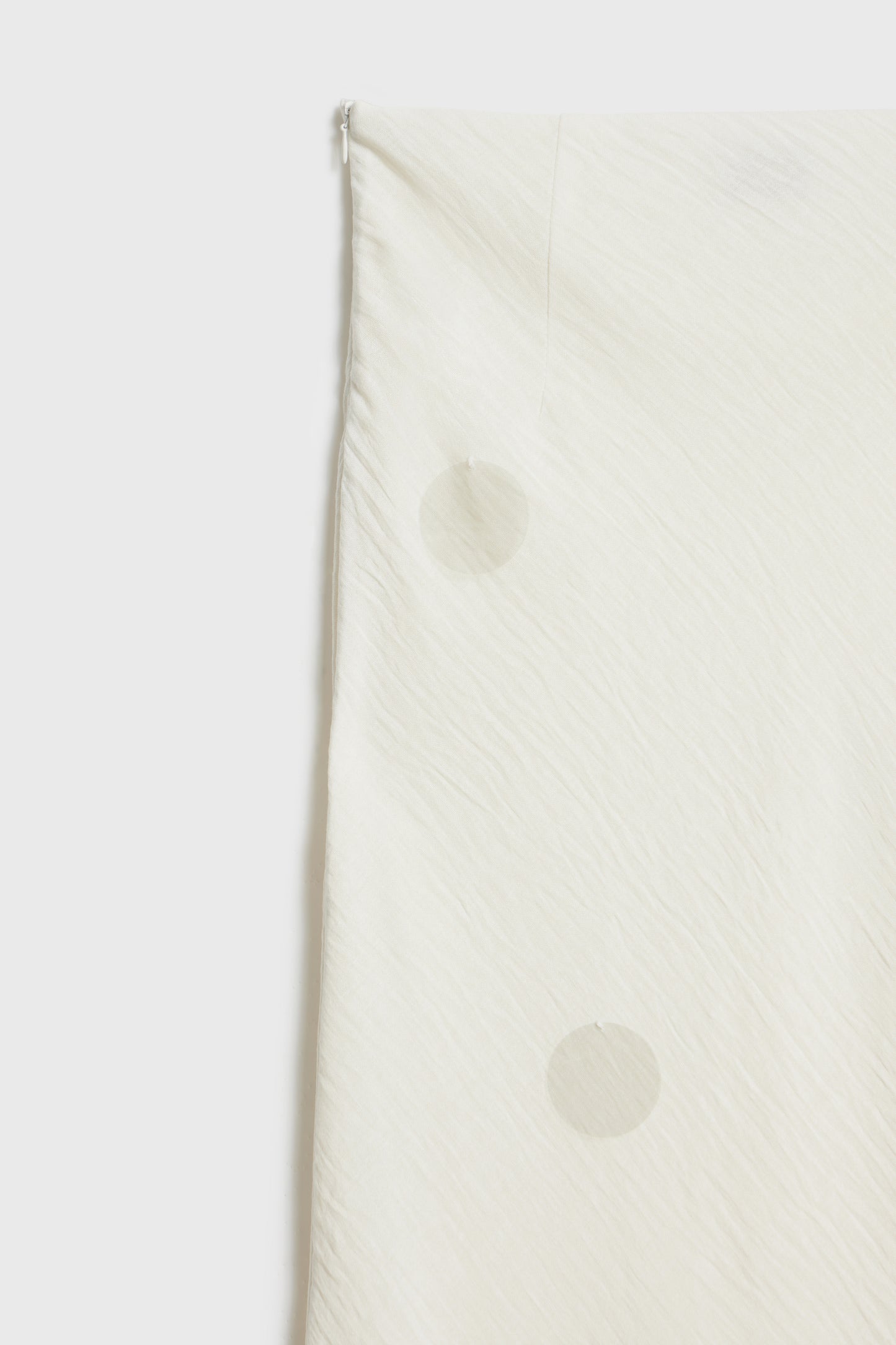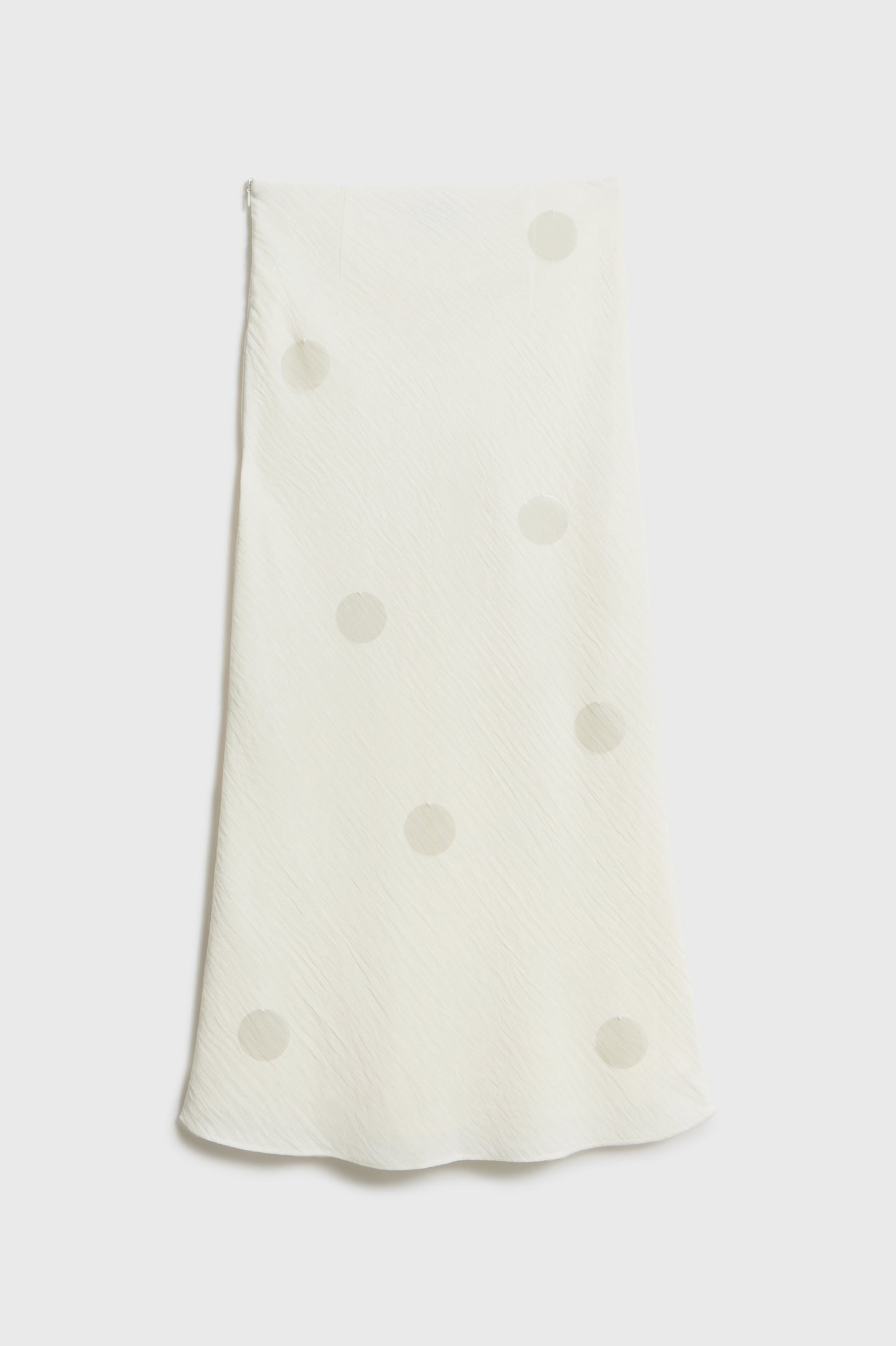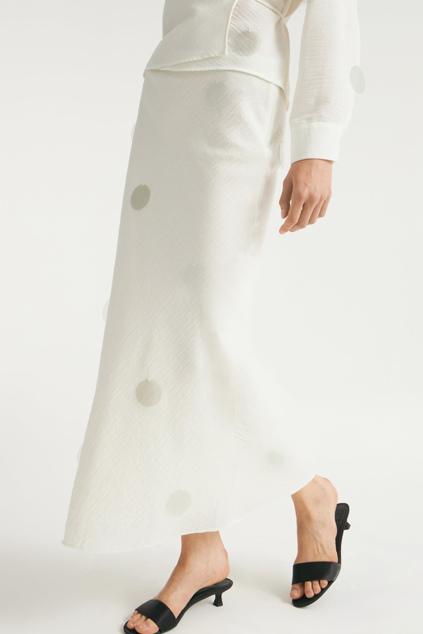 Mid-length, gently flared skirt in textured weave with all-over transparent sequins. Hidden zip closure at side.