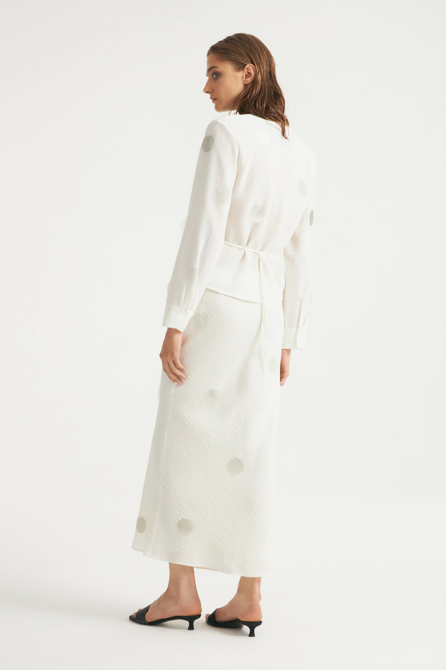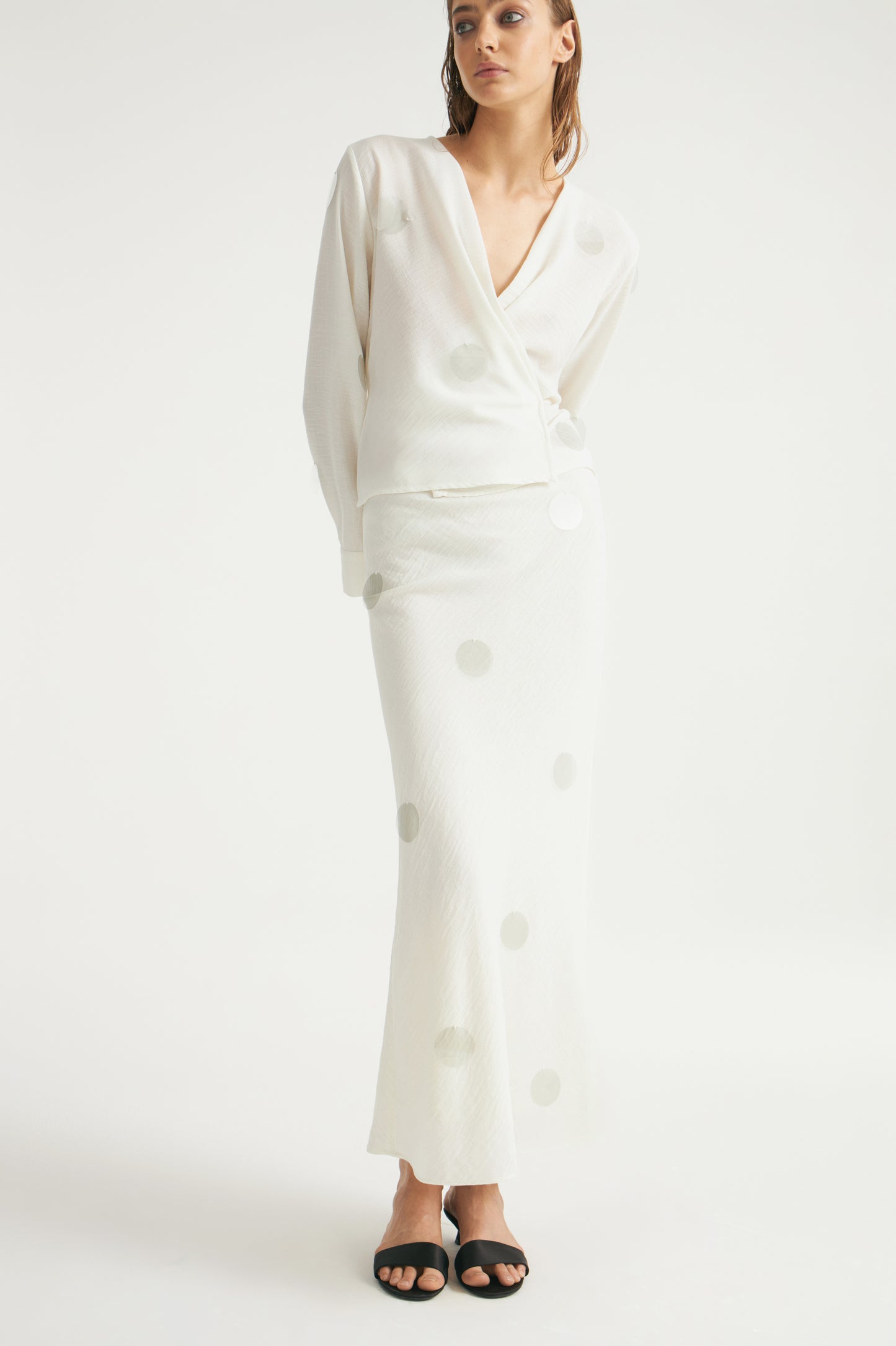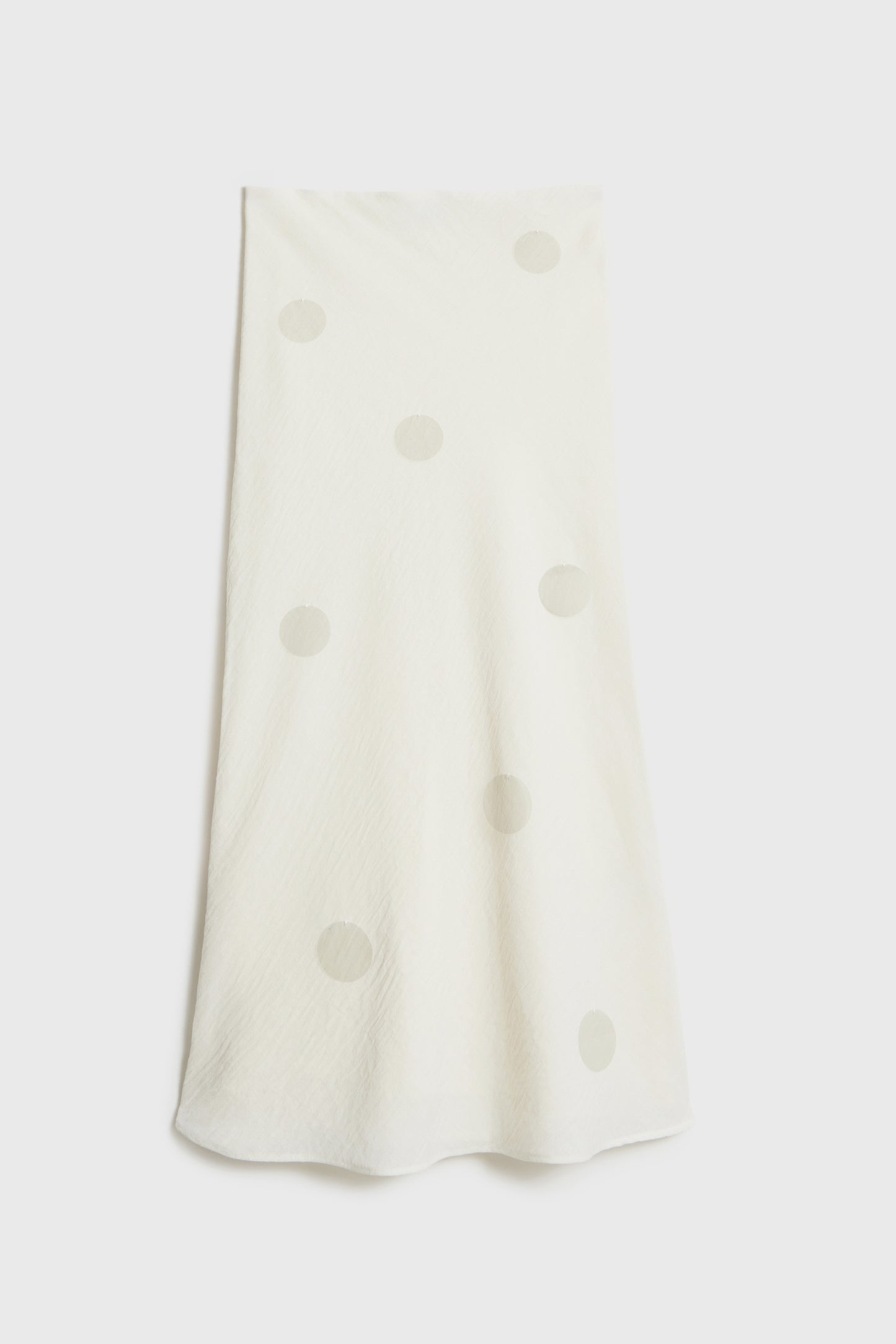 Mid-length, gently flared skirt in textured weave with all-over transparent sequins. Hidden zip closure at side.
