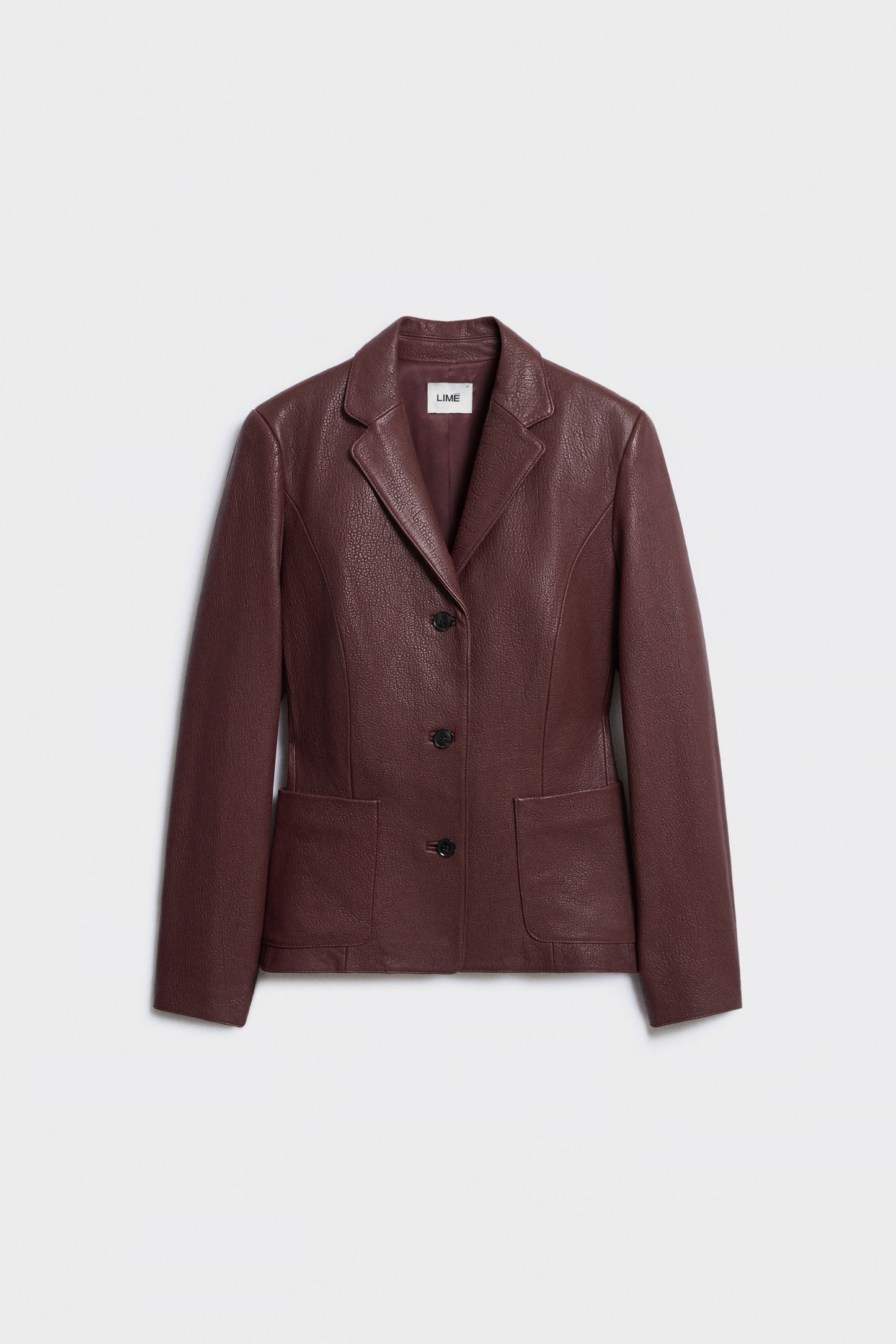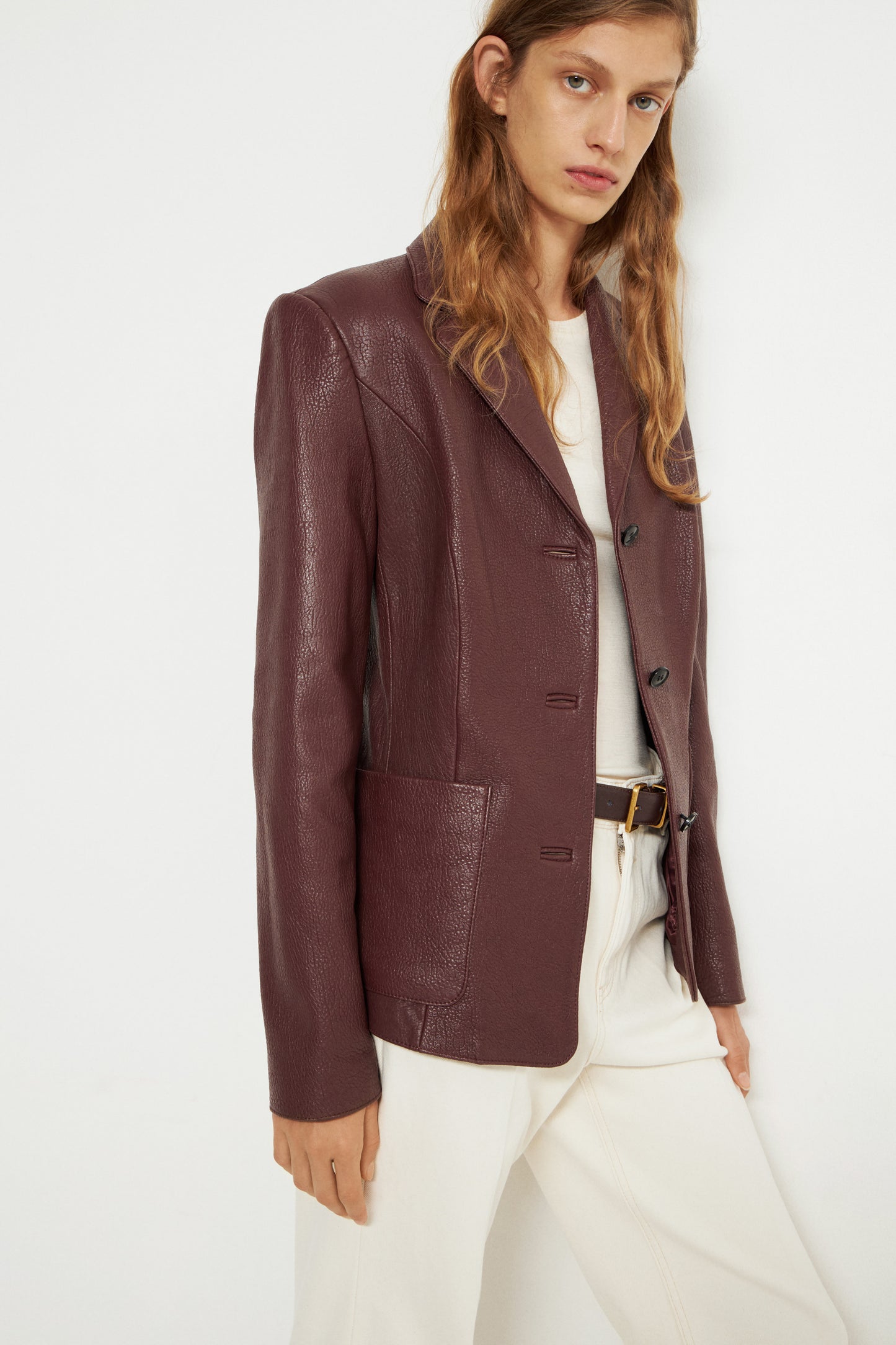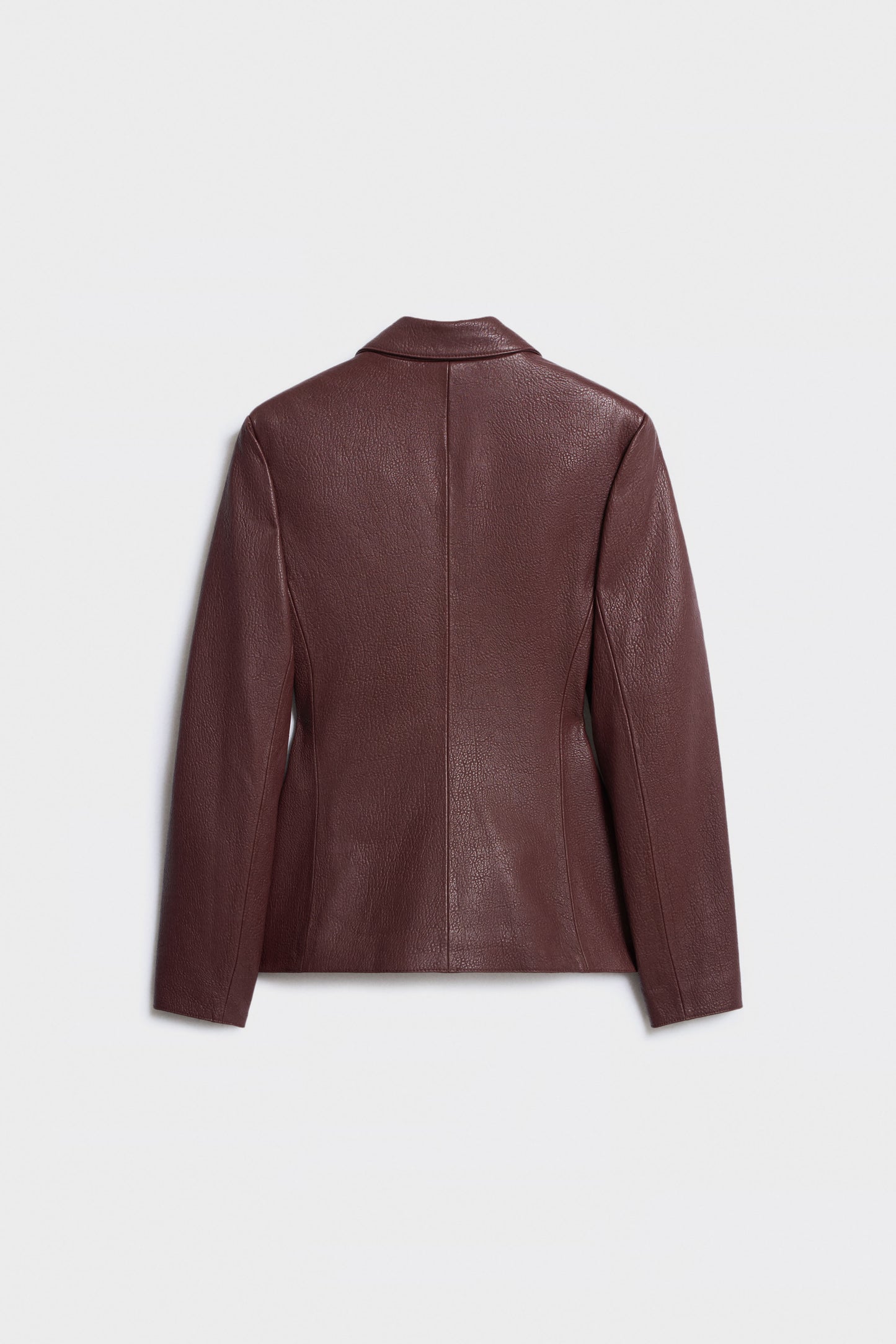 Slim fit blazer crafted from soft sheep leather. Featuring lapel collar and long sleeves, shoulder pads. Front hip pockets. Matching lining. Single-breasted front with buttons.
