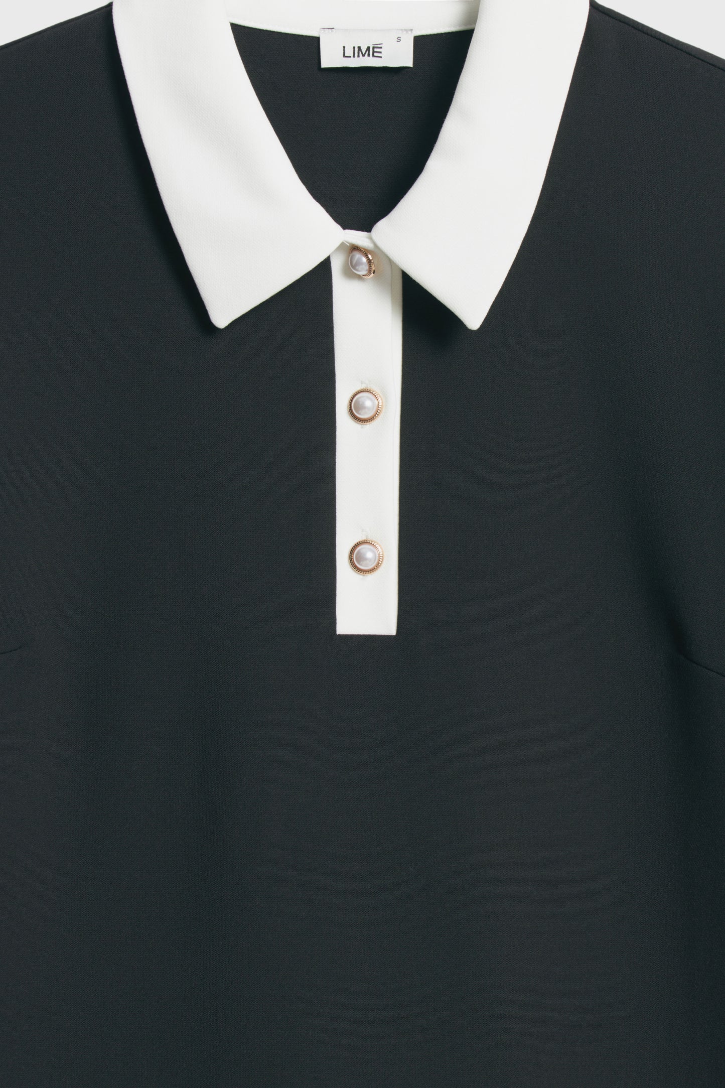 Short dress in woven fabric with contrasting color trims. Collar, button placket with gold-tone pearly buttons and short sleeves. Styled with a flared silhouette.