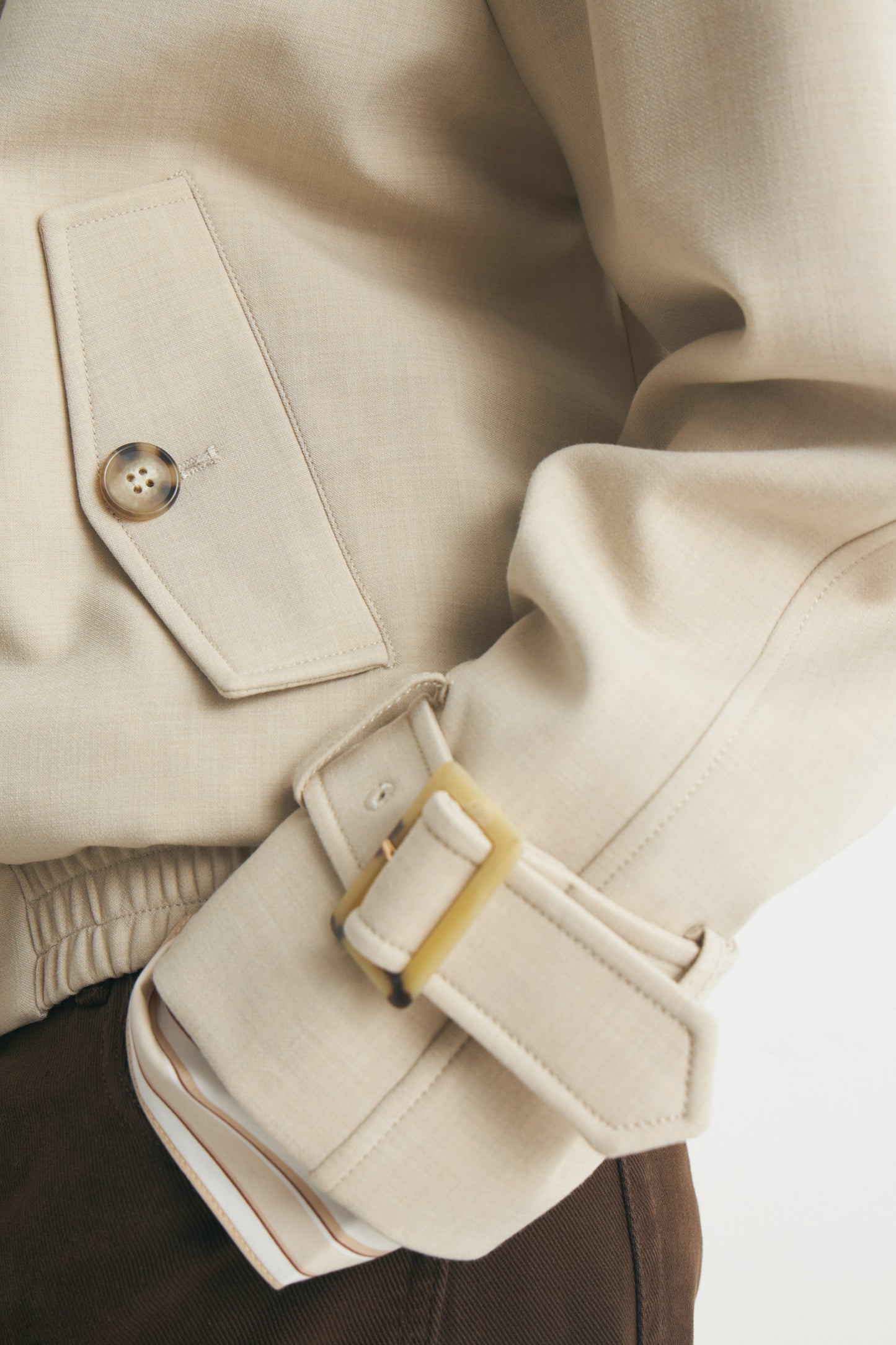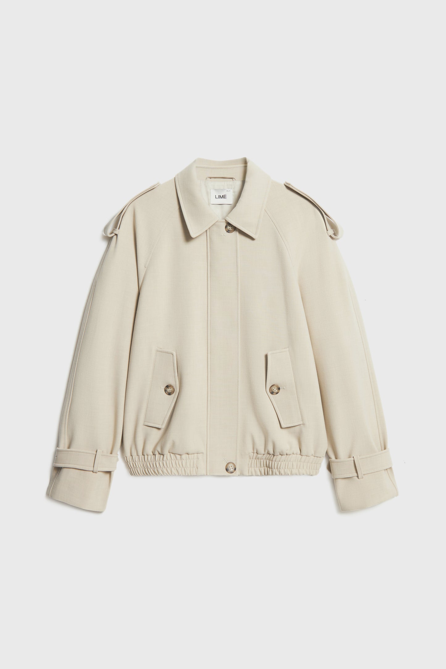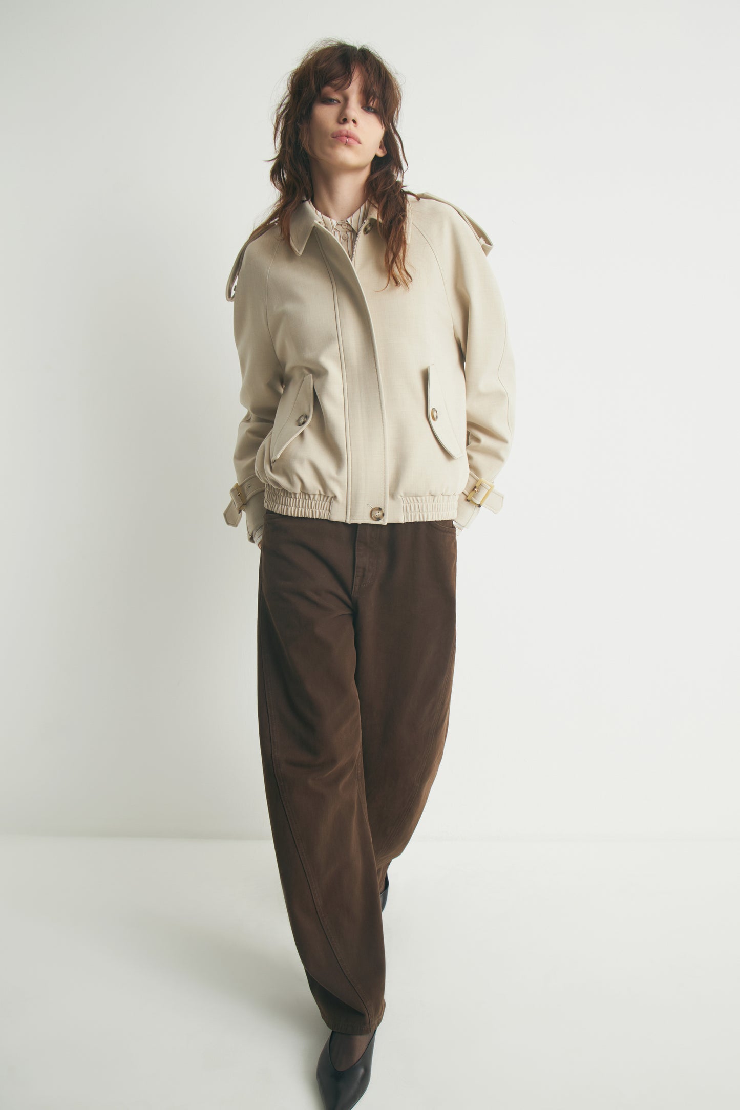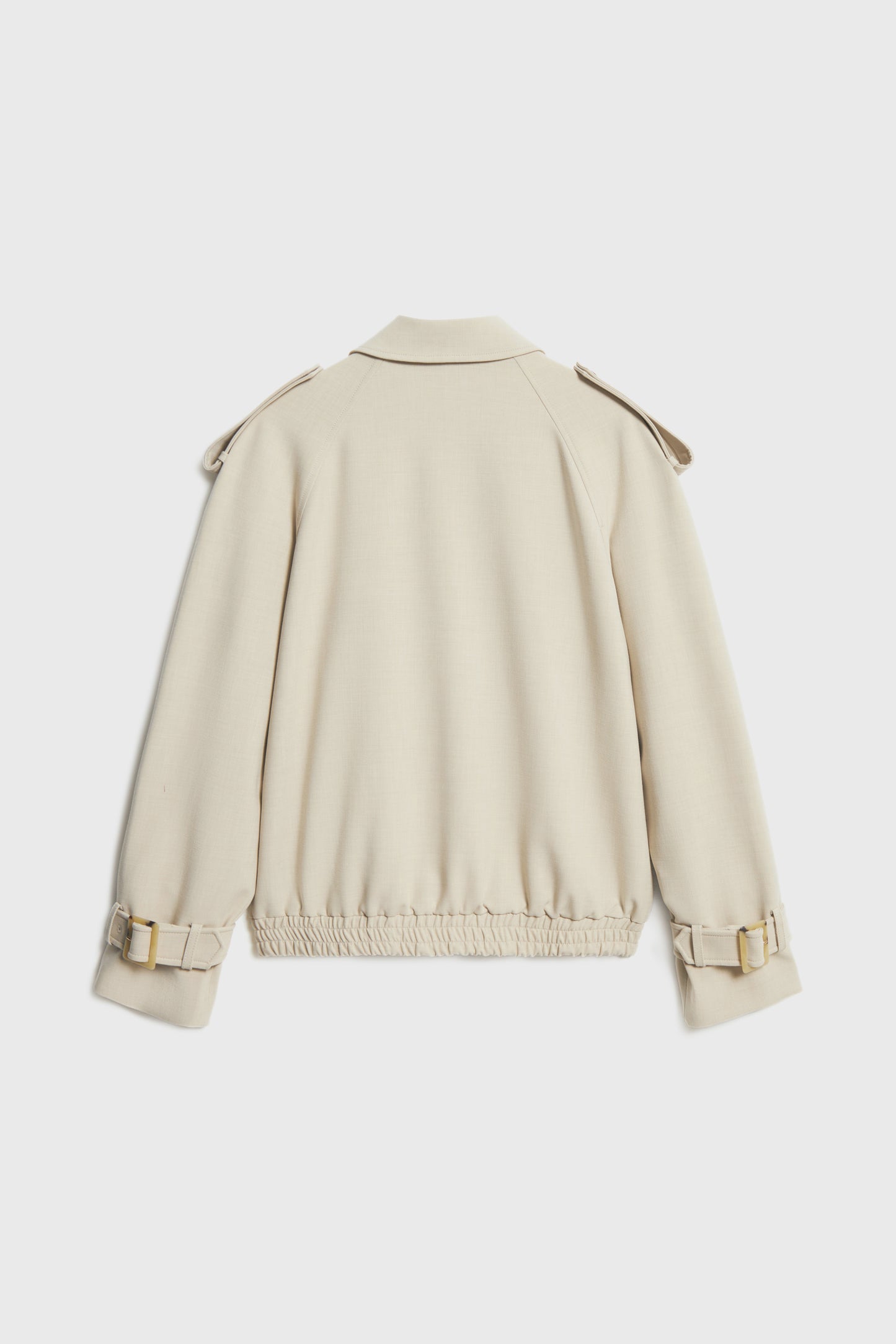 The voluminous shoulders give an oversized look to this biker jacket. Collar, hidden front zipper, shoulder tabs with button fastener, long raglan sleeves with cuffs and elasticized hem. Two flap side pockets with buttons. Viscose-blend satin lining.