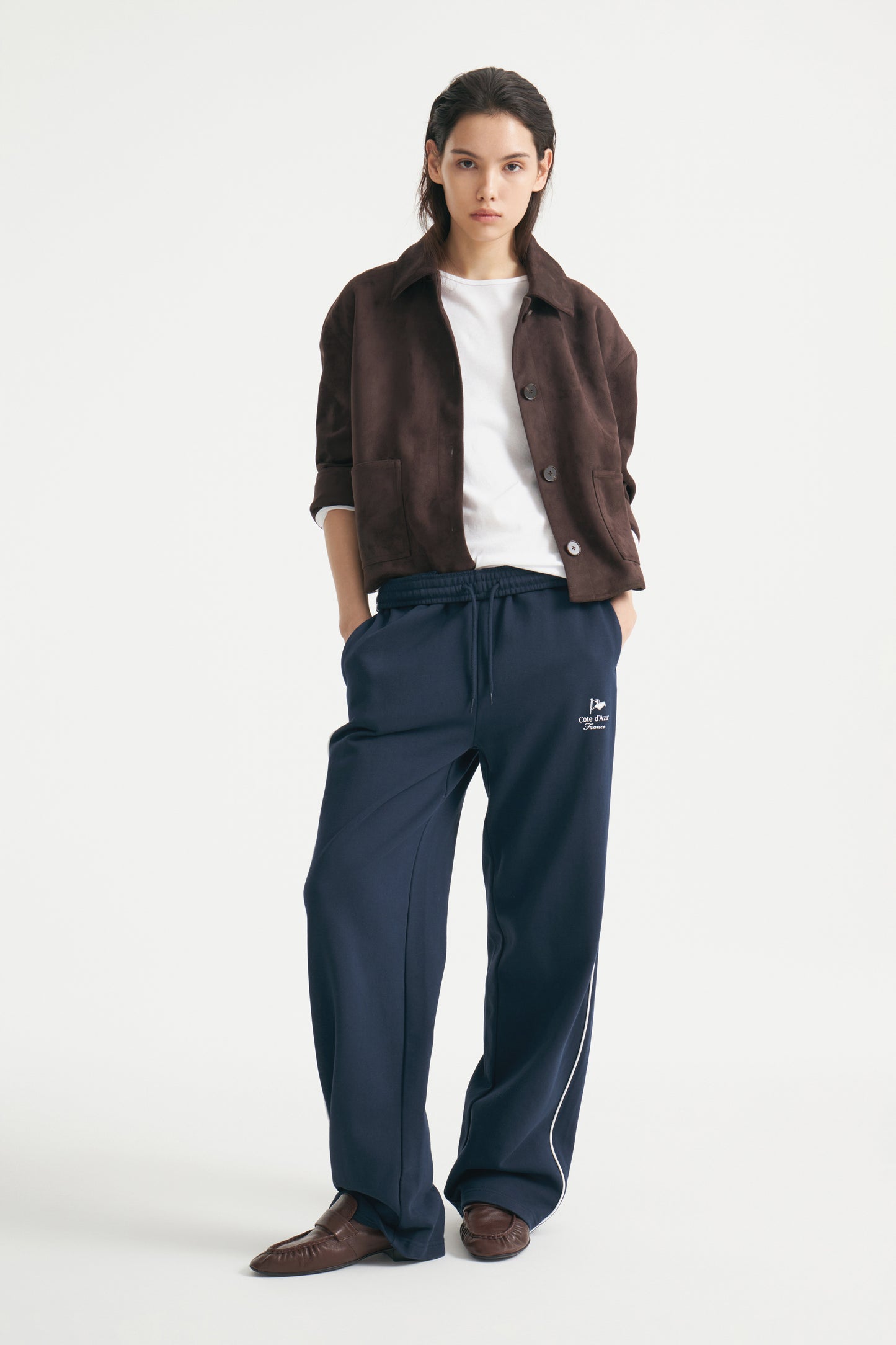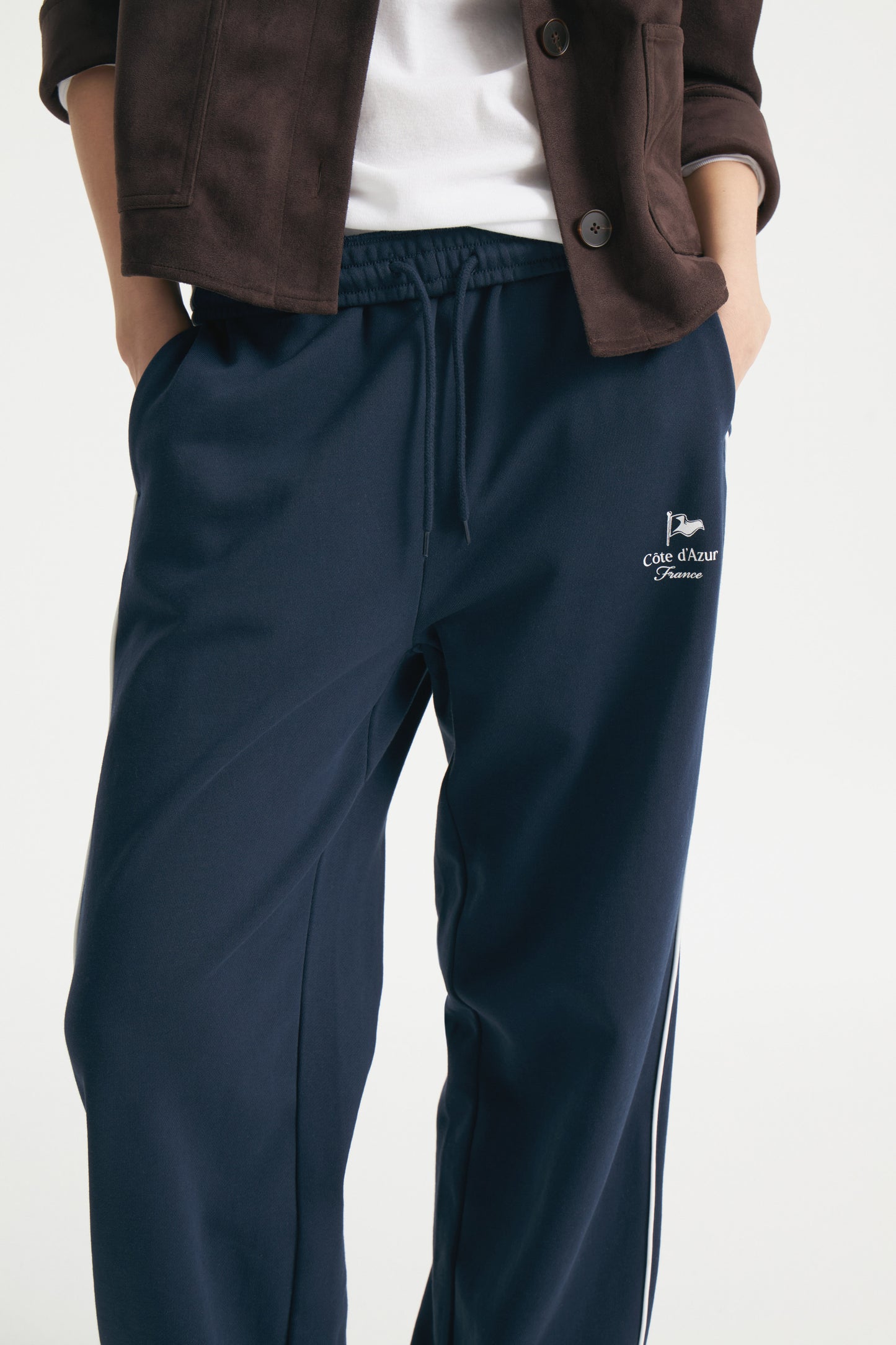 Crafted from cotton terry trousers featuring an elasticated, drawstring waist, discreet pockets in the side seams. Straight legs, side stripes with contrast piping and a text motif.