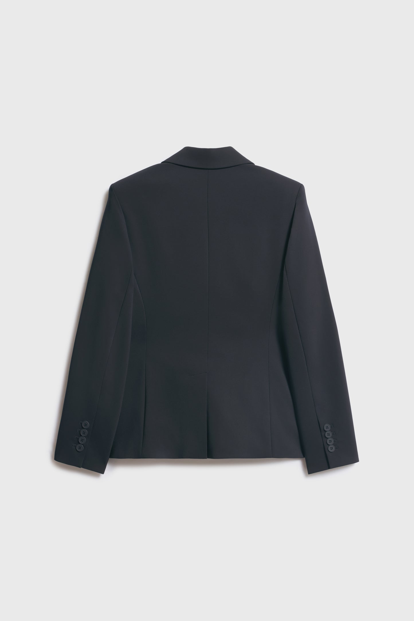 Tailored blazer featuring a lapel collar and long sleeves with shoulder pads. Front pockets with flaps, fake chest pocket. Matching lining. Single-breasted front with button.