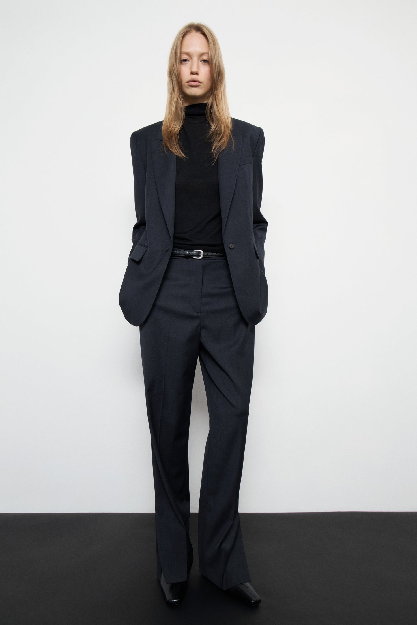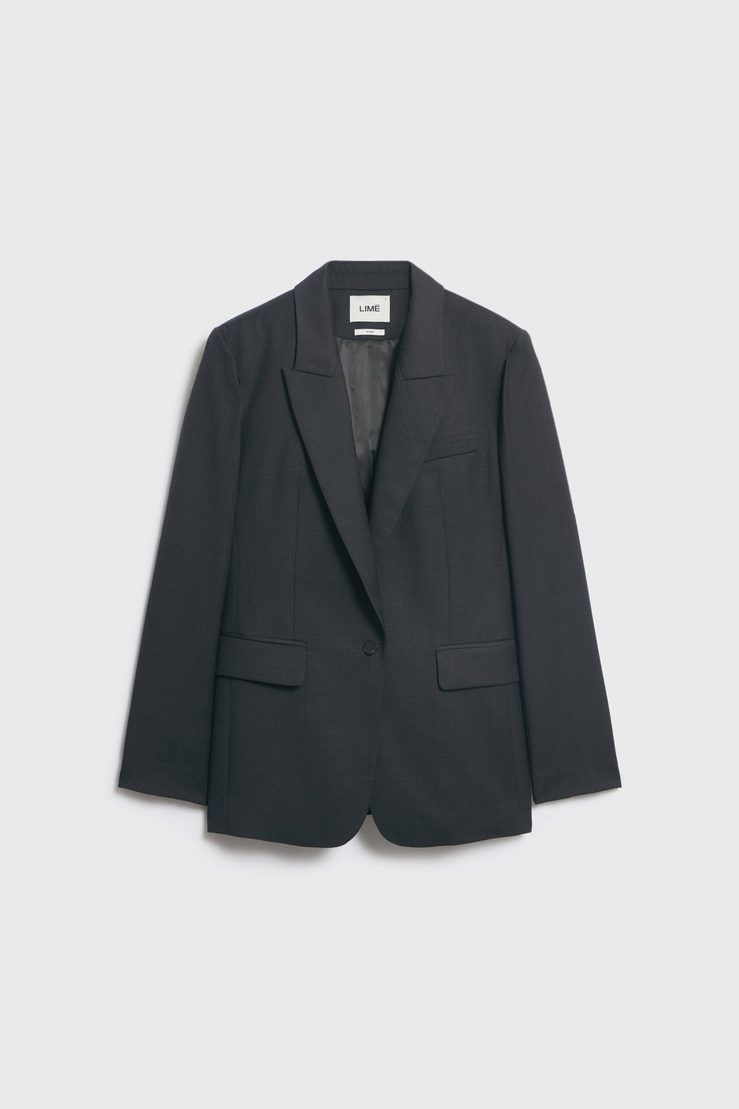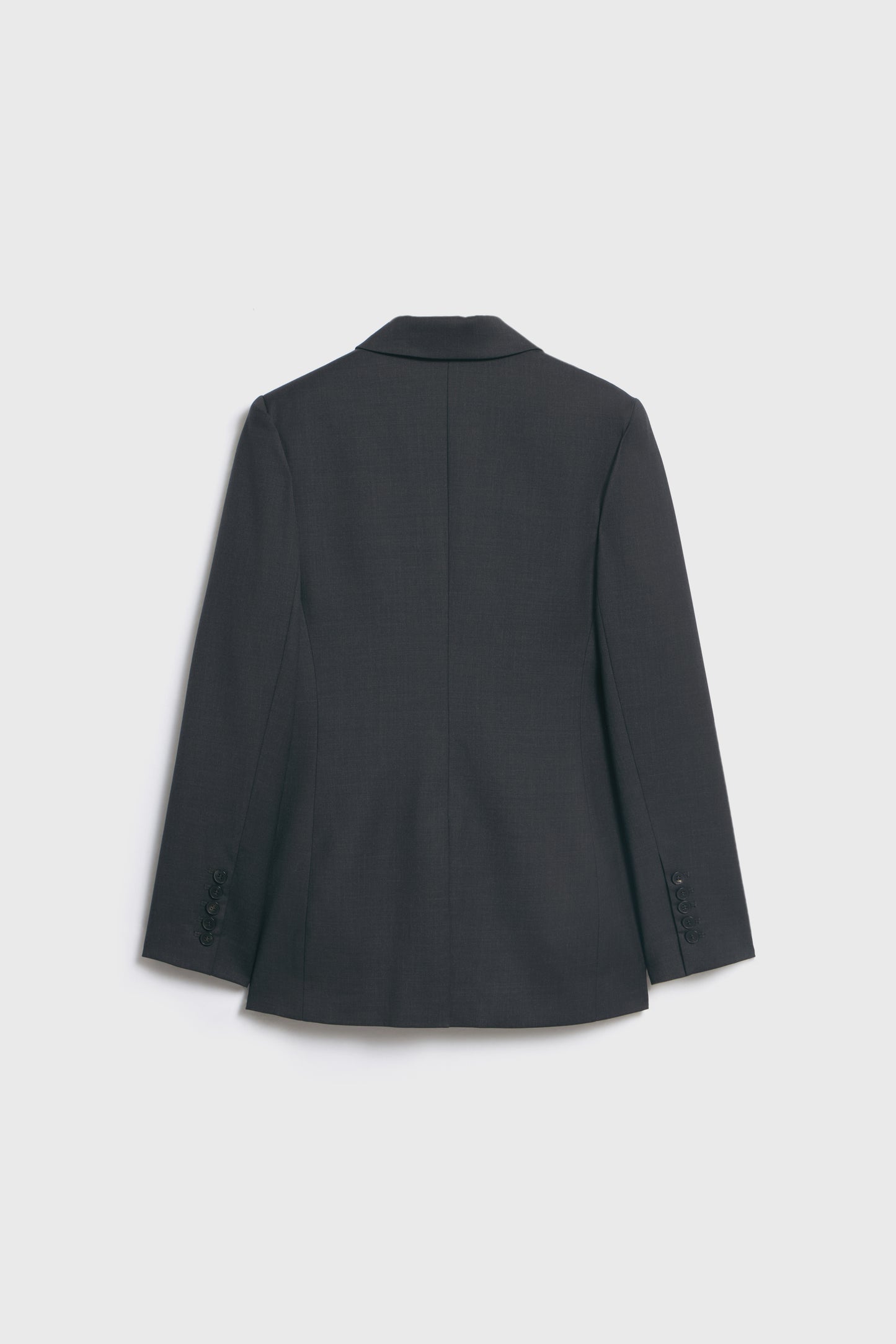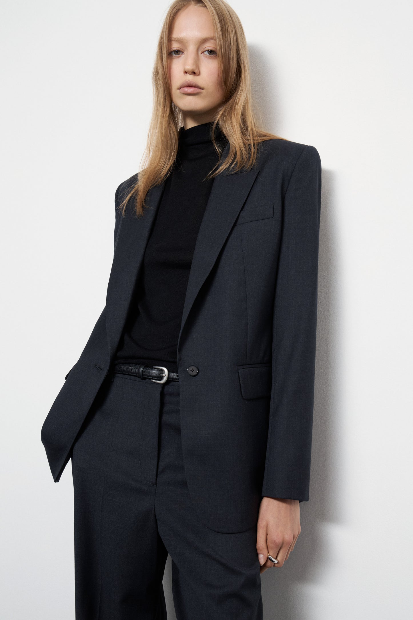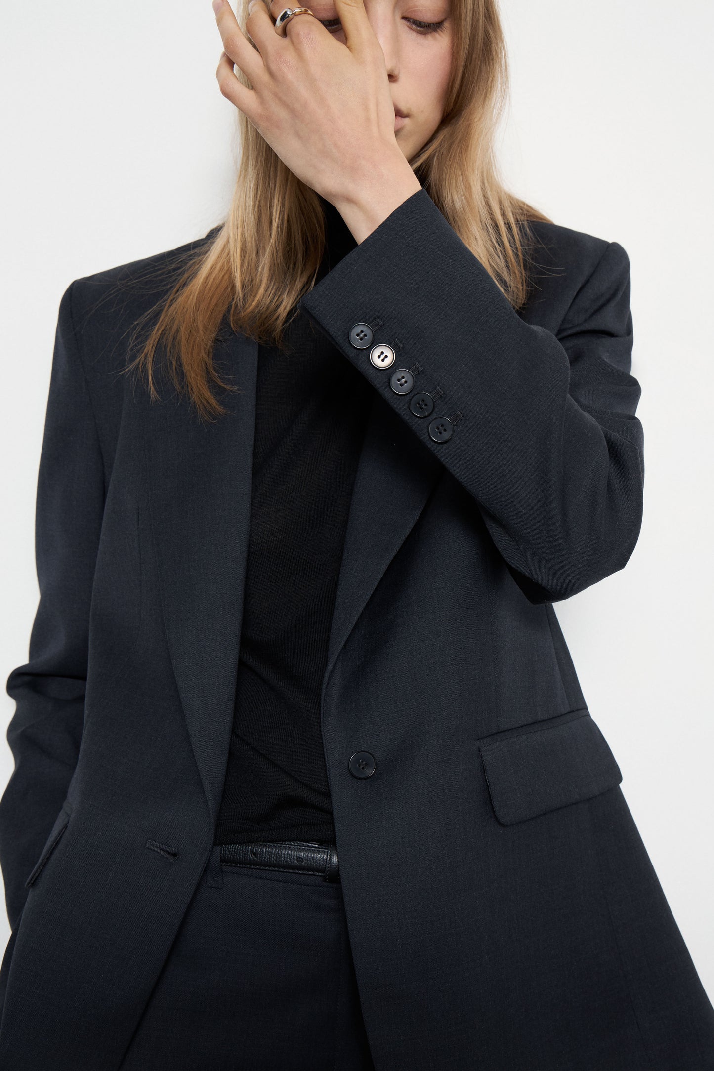 Single-breasted jacket in a wool blend weave. Features lapels, flap front pockets and inner shoulder pads. One button at the front. Lined.