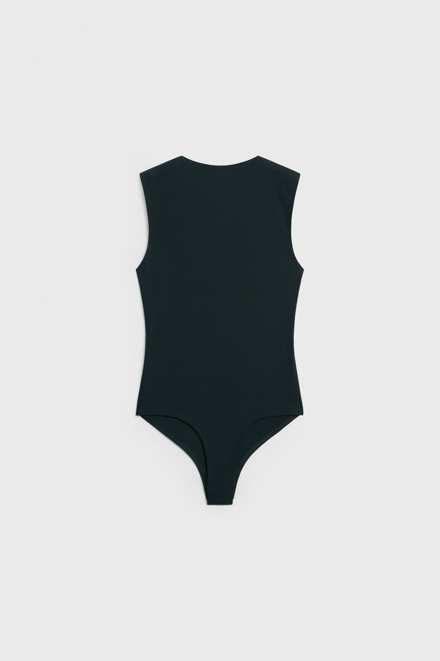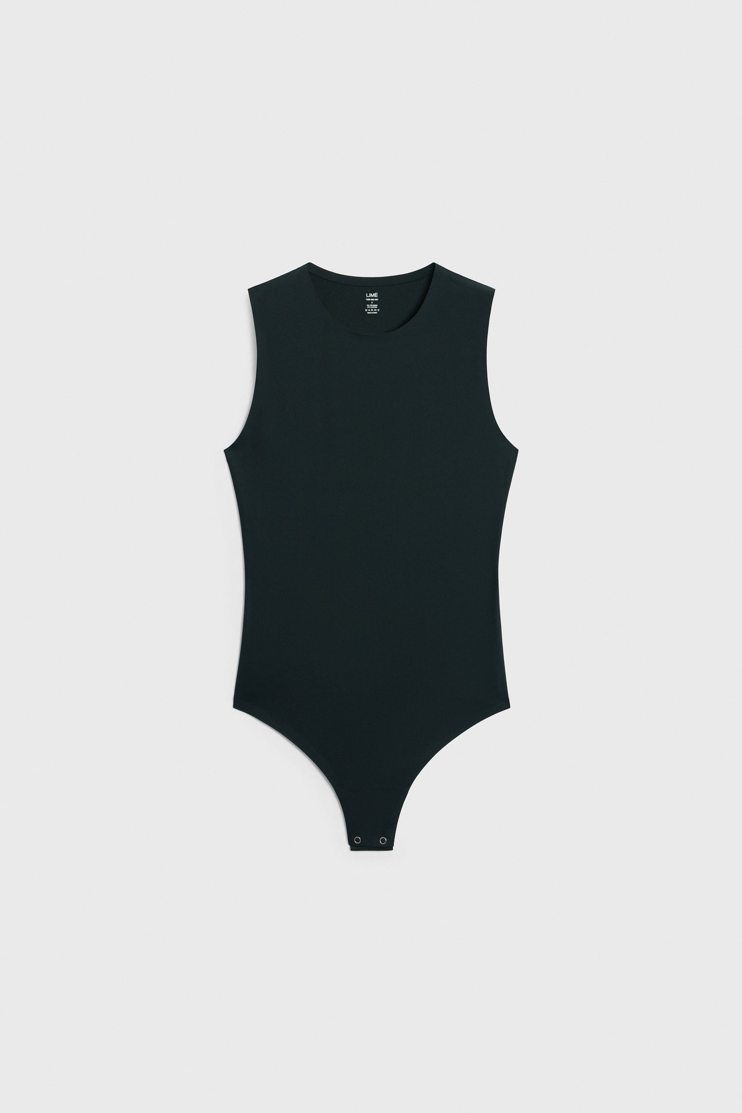 Microfibre sleeveless bodysuit with round neck and snap-button fastening at the bottom.