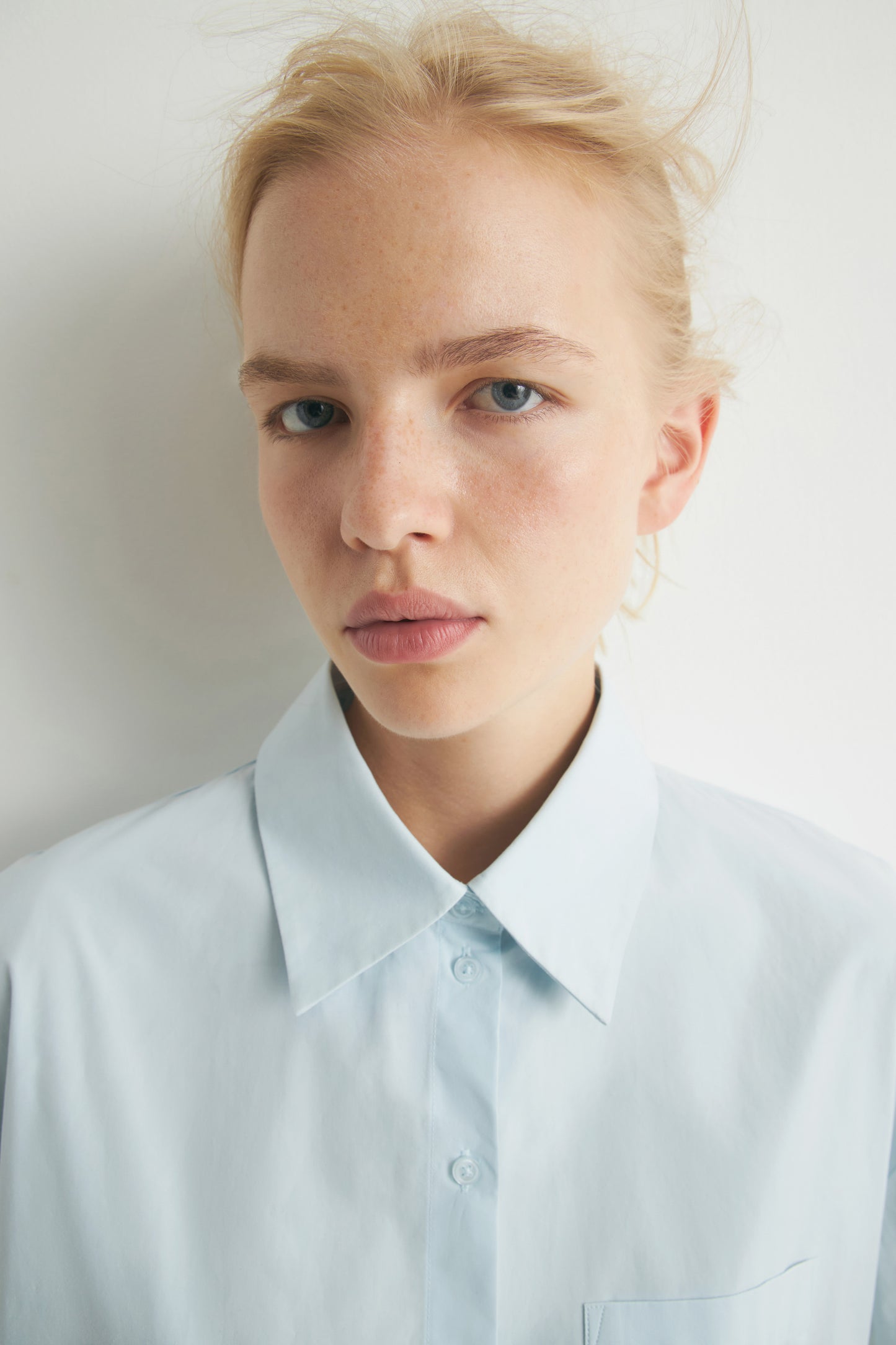Straight-fit shirt with short sleeves in cotton poplin. Featuring a collar and open chest pocket. Rounded hem. Button-up front.