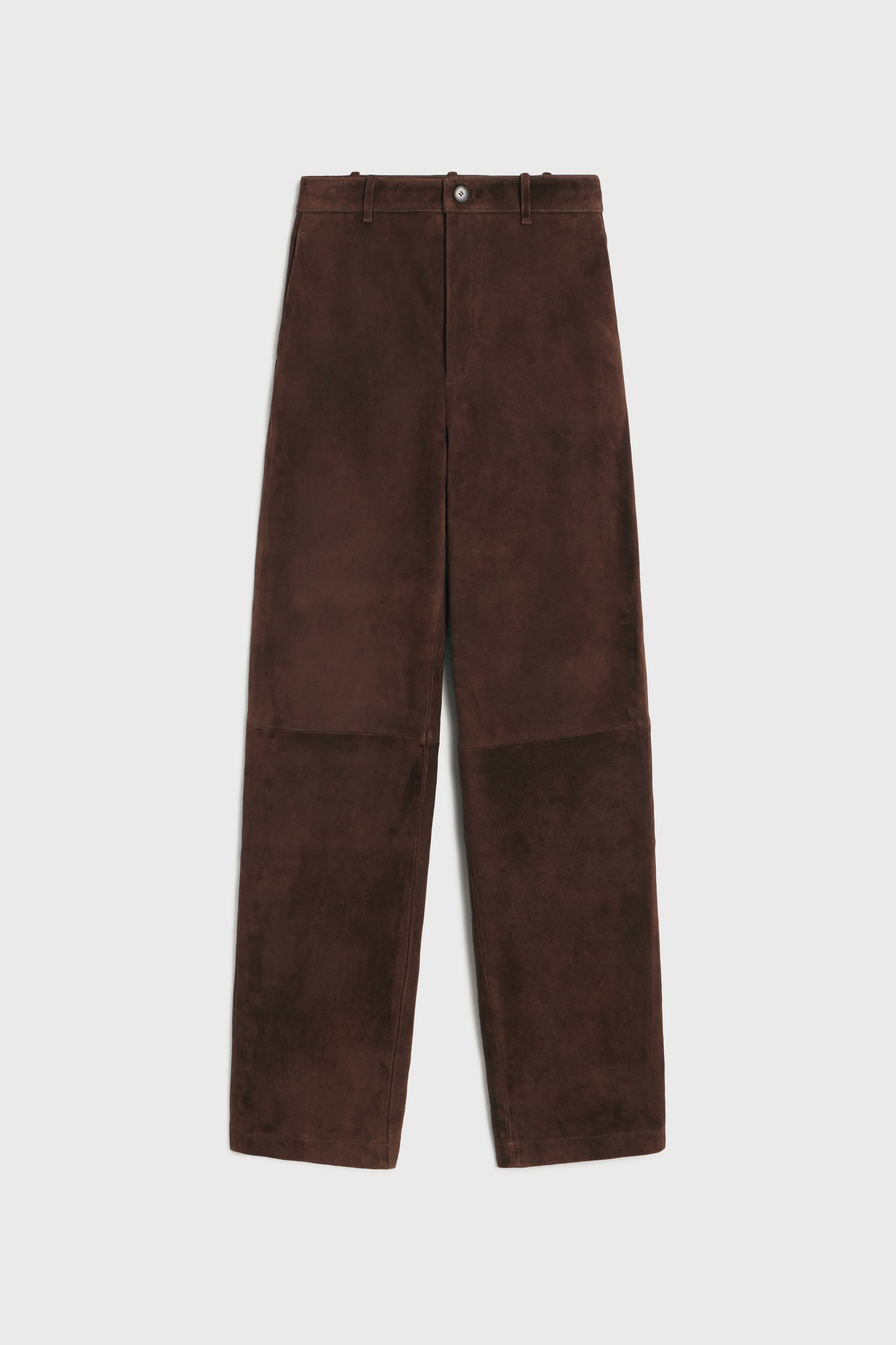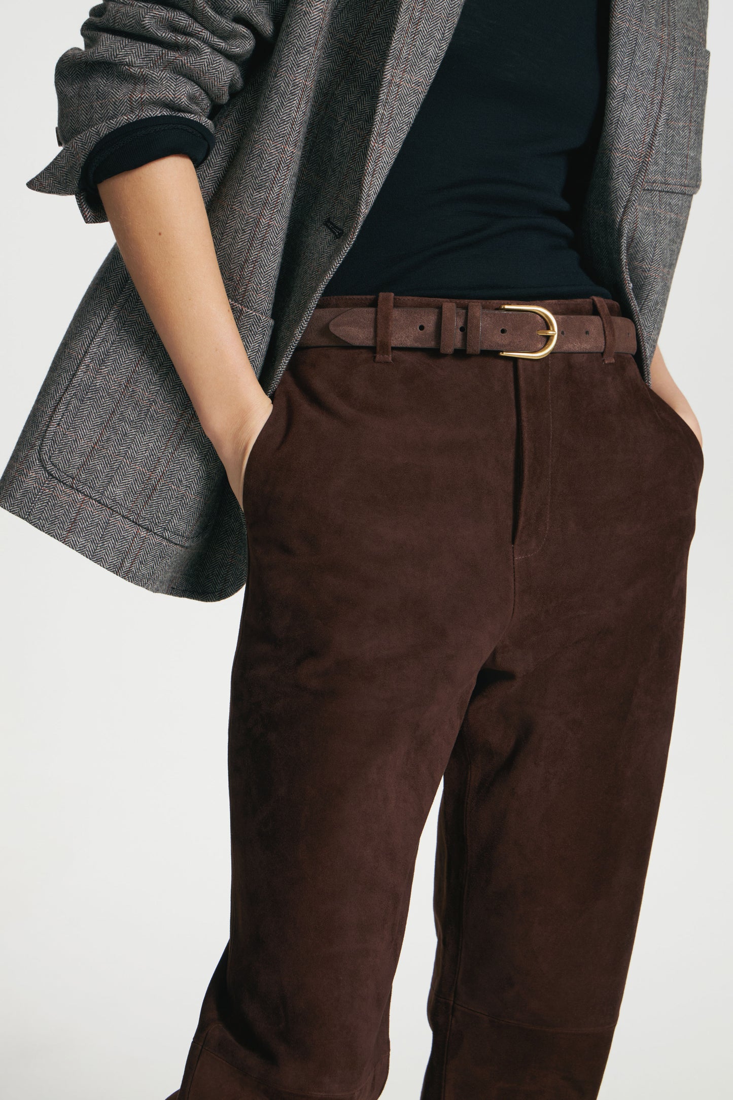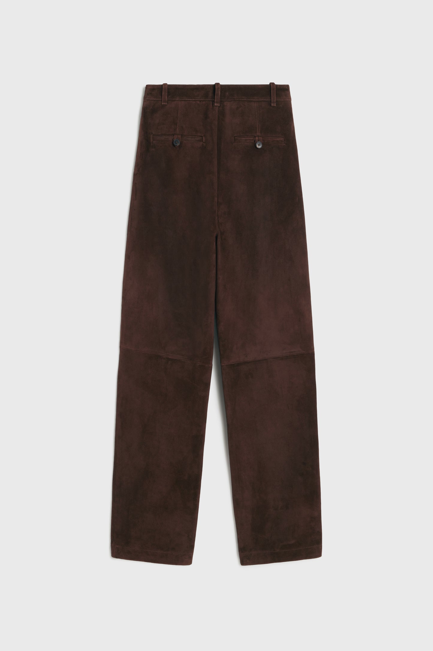 Straight fit trousers in soft suede with front pockets and welt back pockets. Visible seam details on the front and back. Zip fly and top button fastening.
