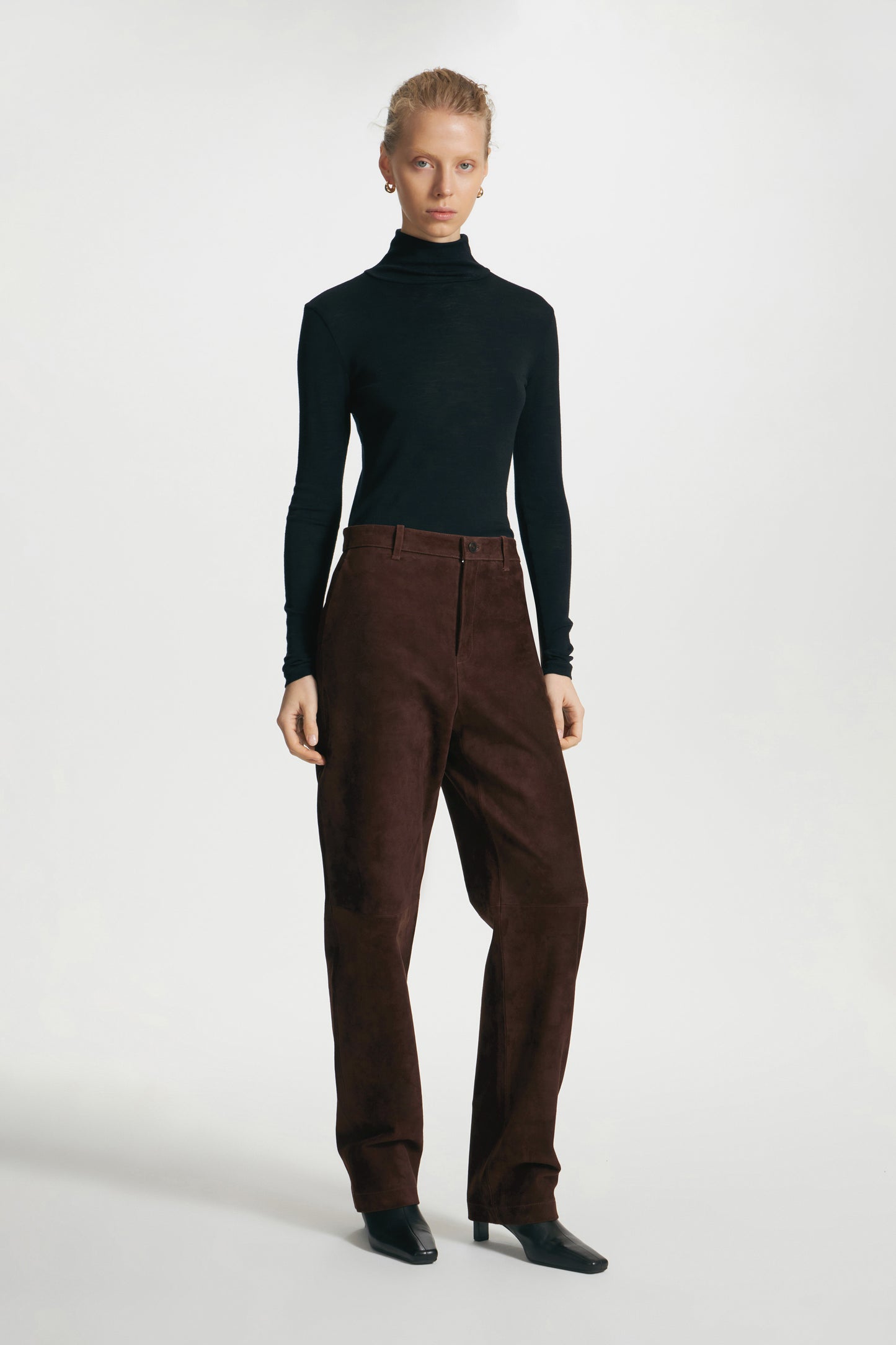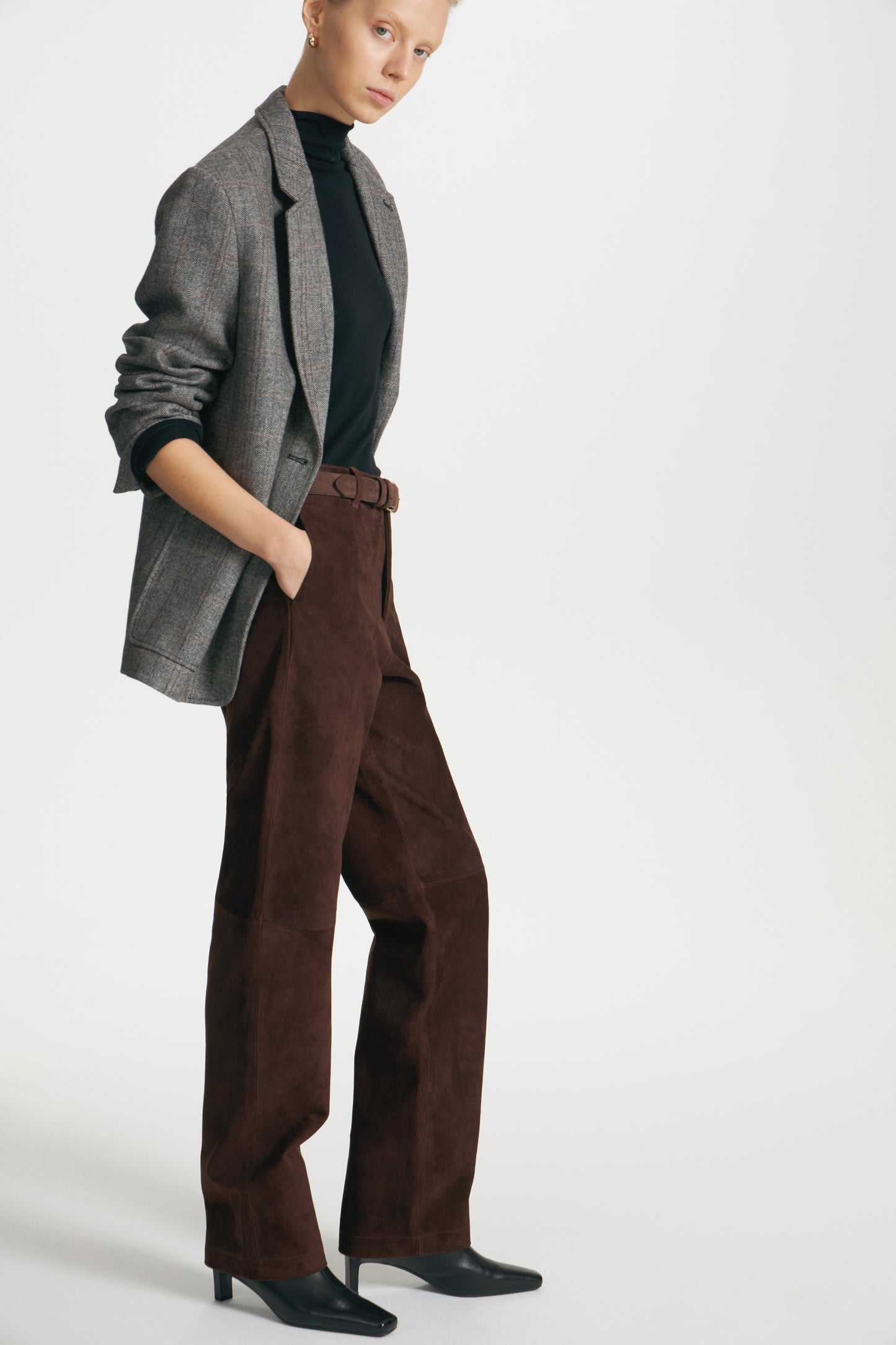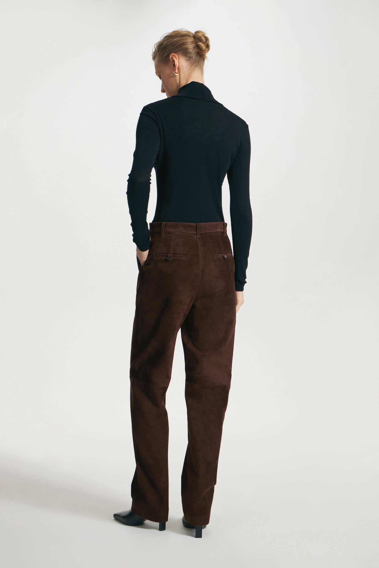 Straight fit trousers in soft suede with front pockets and welt back pockets. Visible seam details on the front and back. Zip fly and top button fastening.