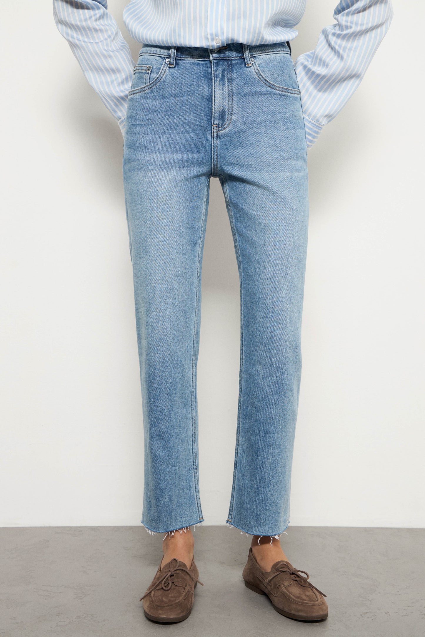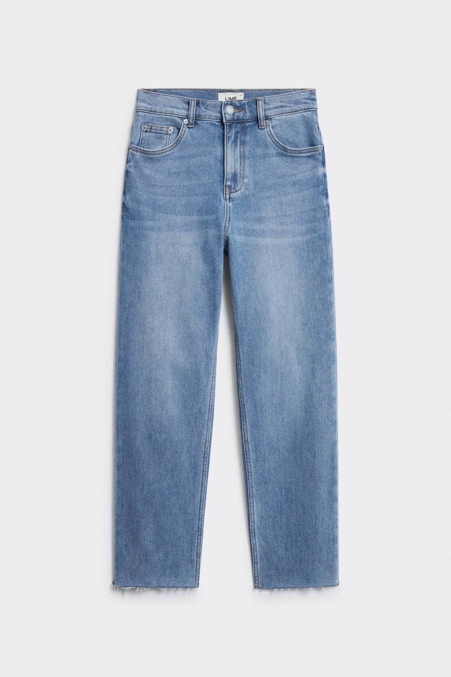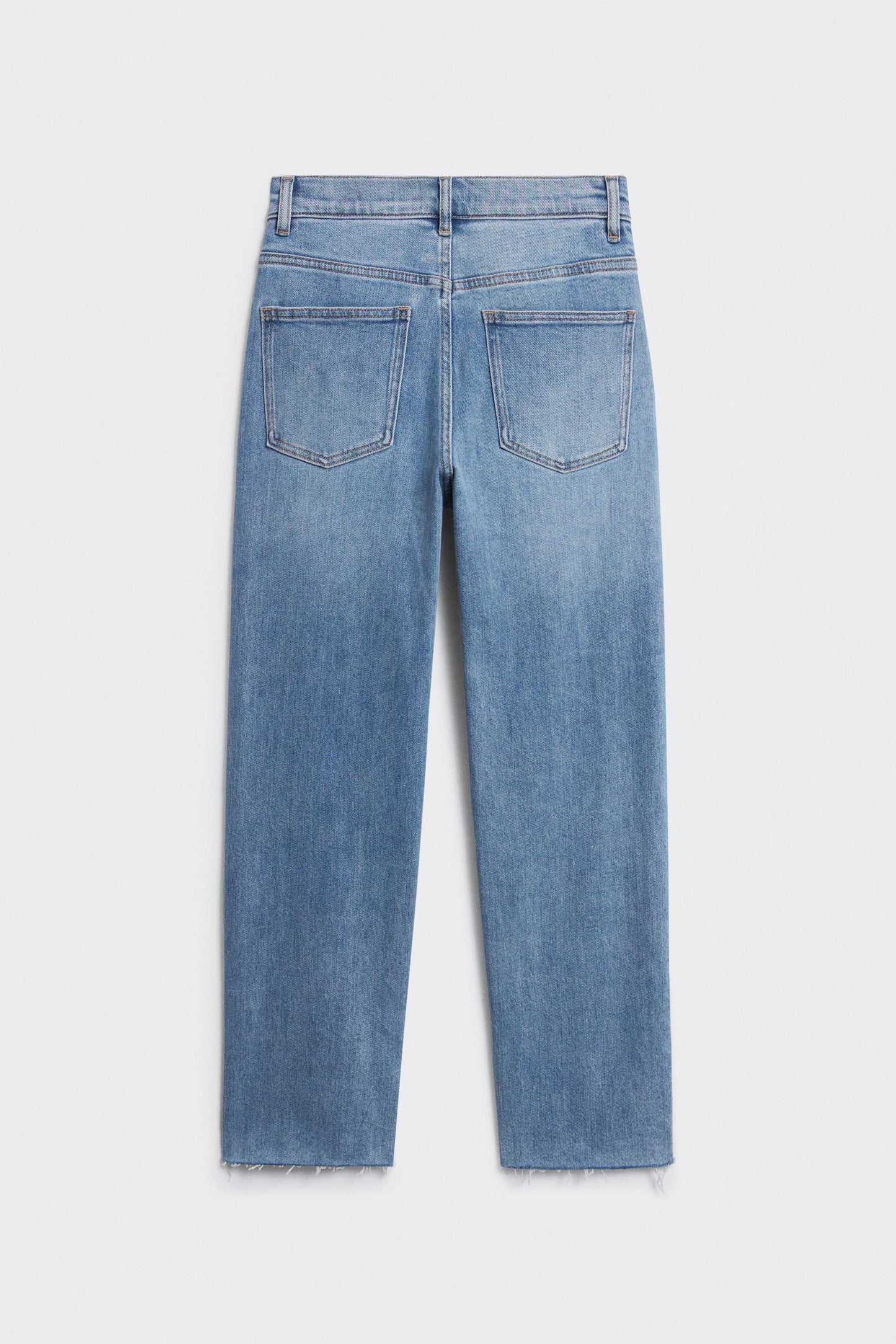 5-pocket jeans in slightly stretchy cotton denim with a high waist. Washed effect. Straight legs with unfinished hem. Front zip fly and top button fastening.