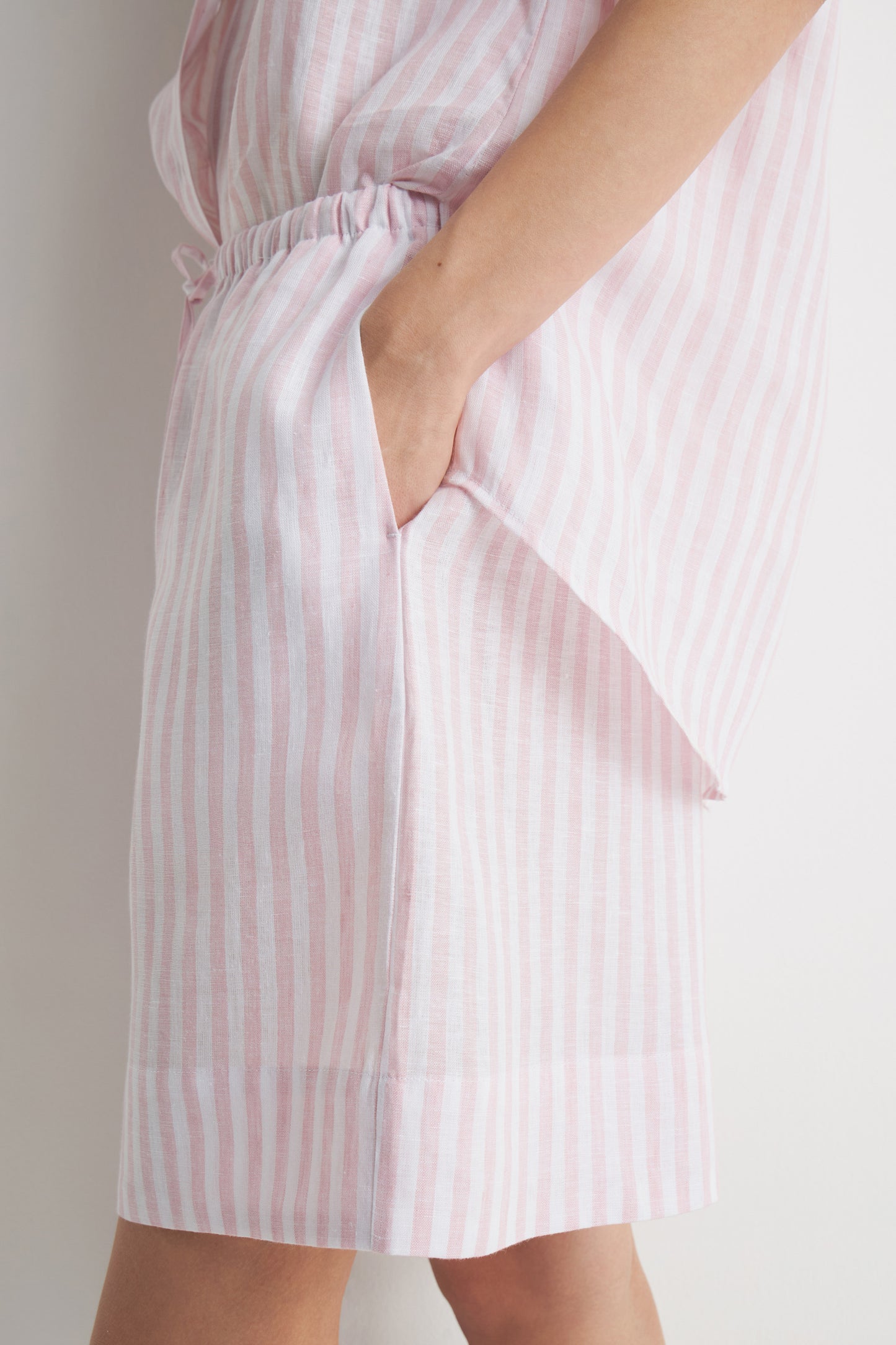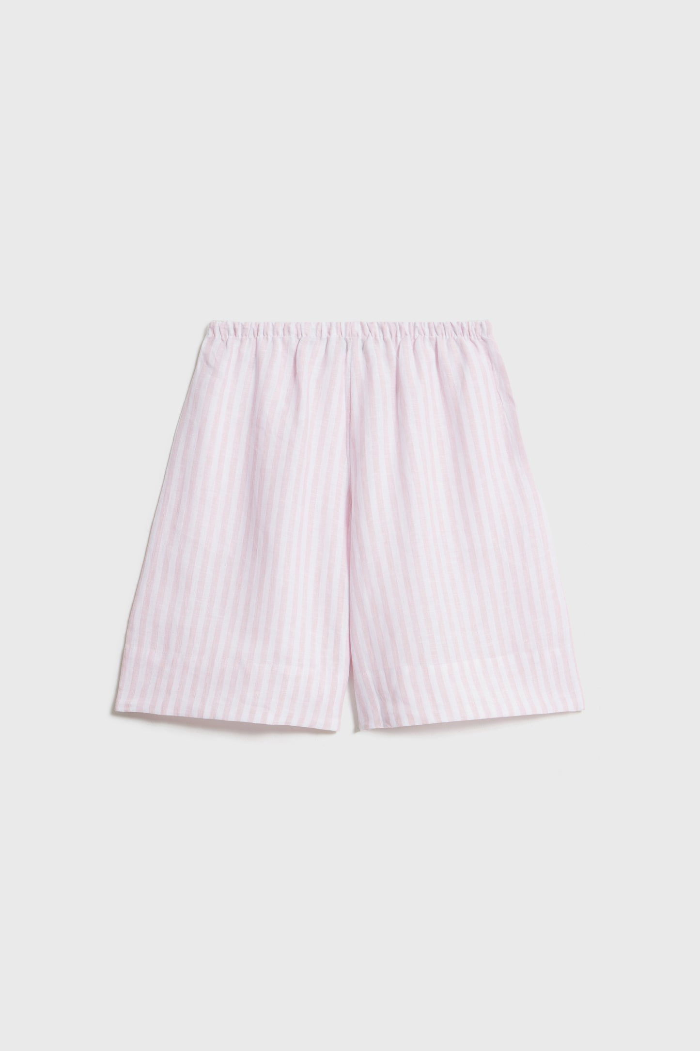 Shorts in striped airy linen complemented by drawstring waist, and diagonal side pockets. Straight, wide legs.