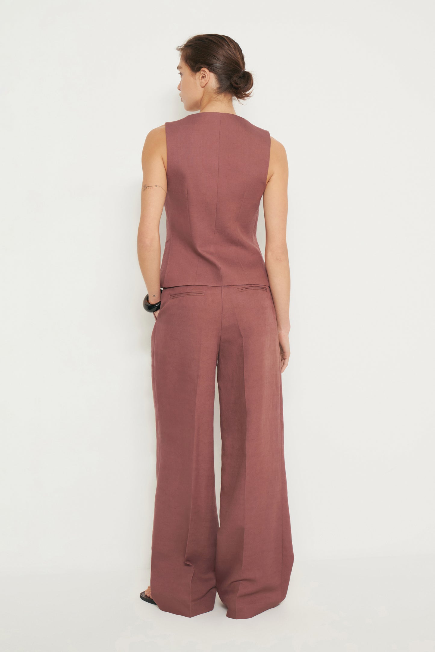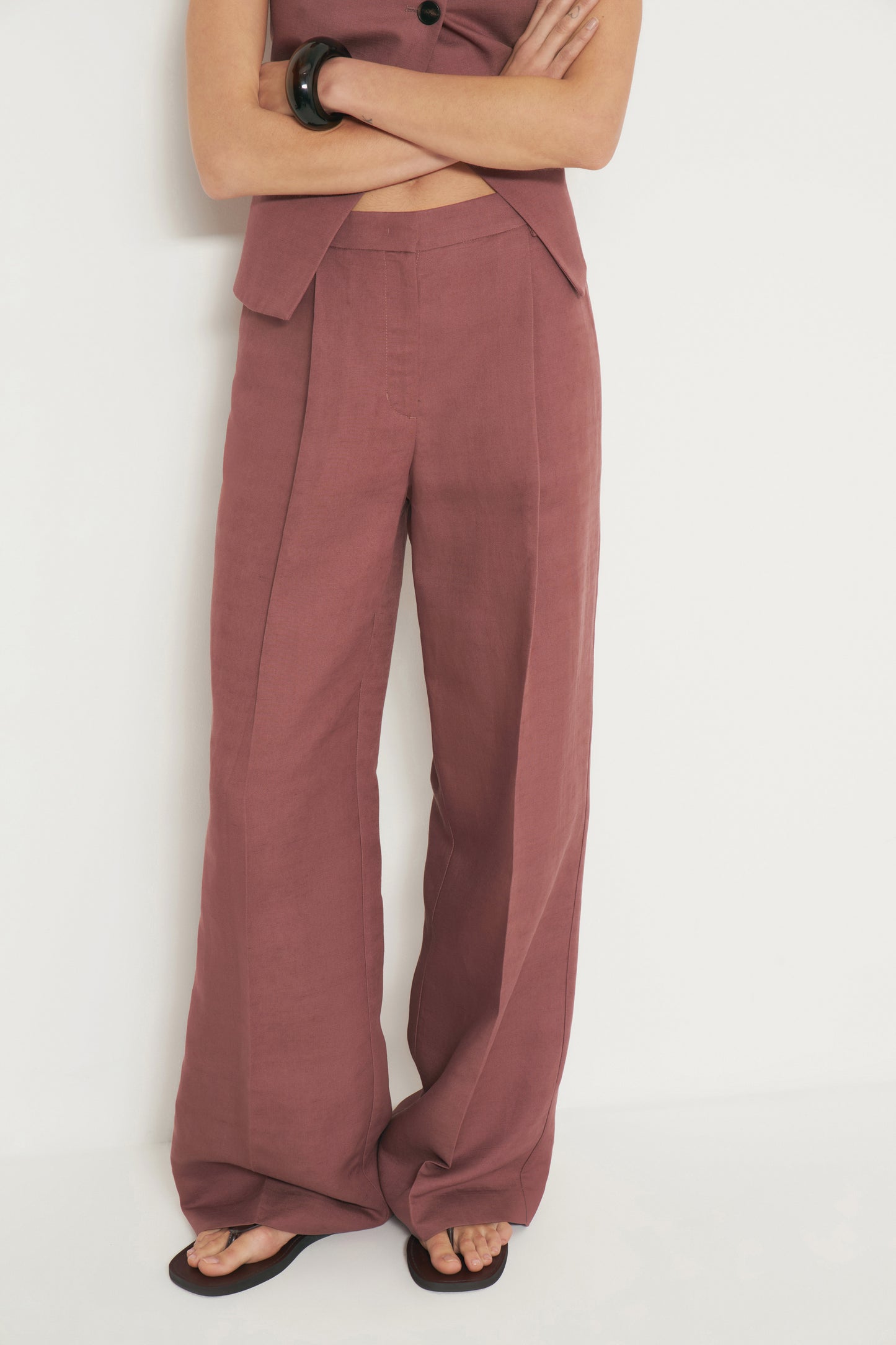 Trousers with darts in woven fabric made from a lyocell and linen blend. Front pockets and back welt pockets. Straight-leg design. Front zip fly, top button and metal hook fastening.