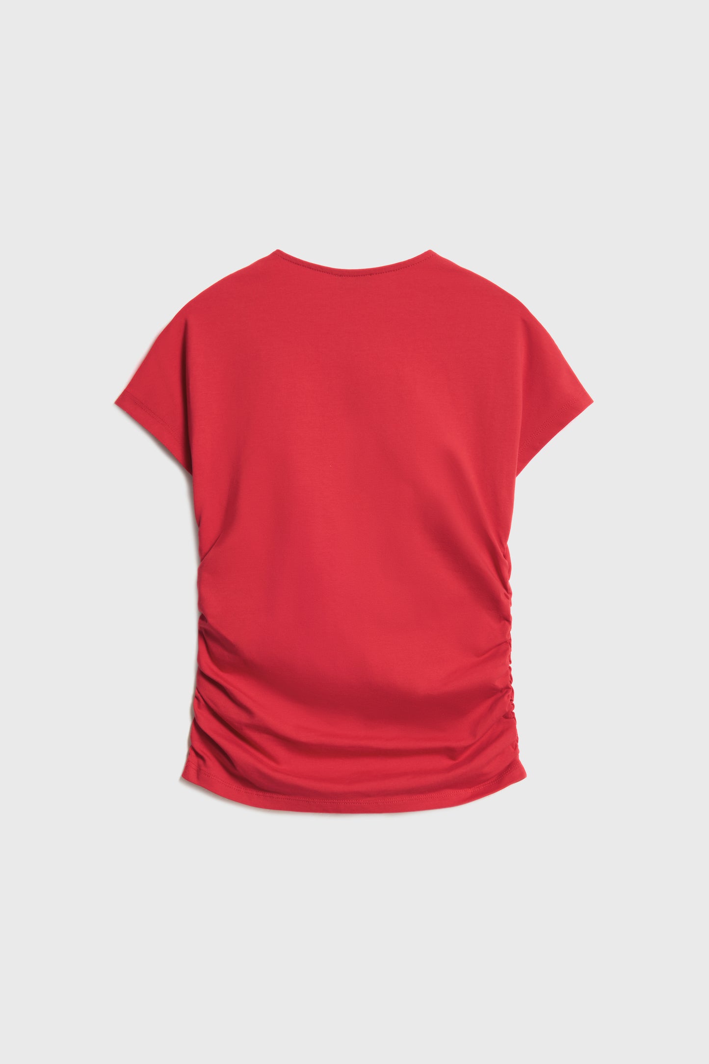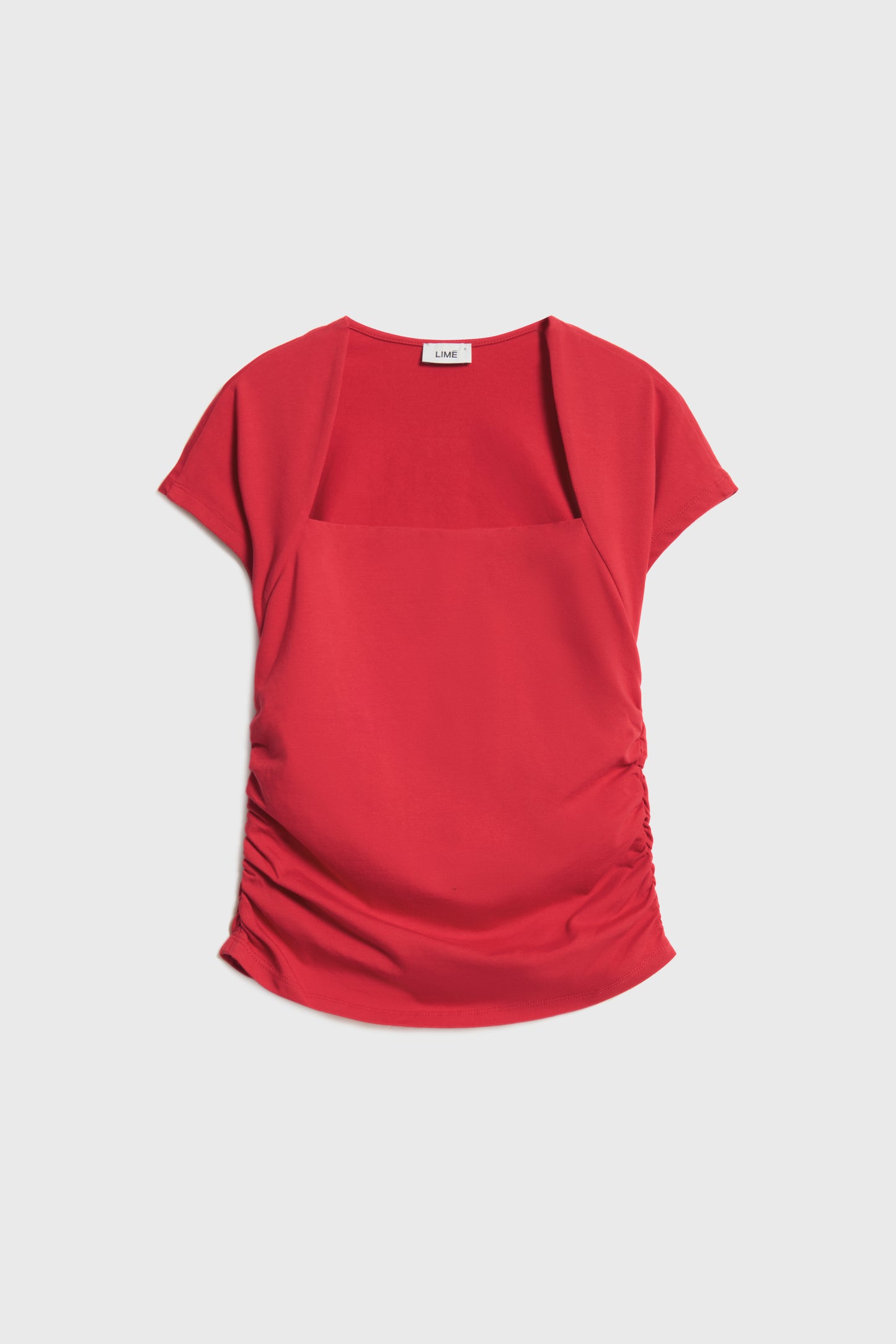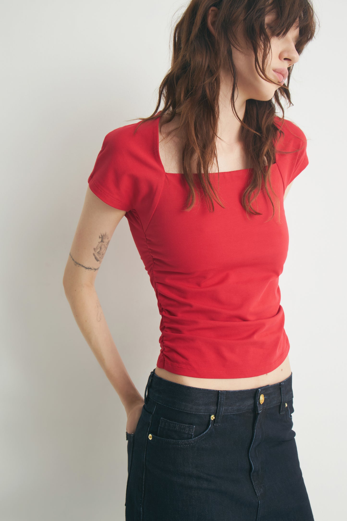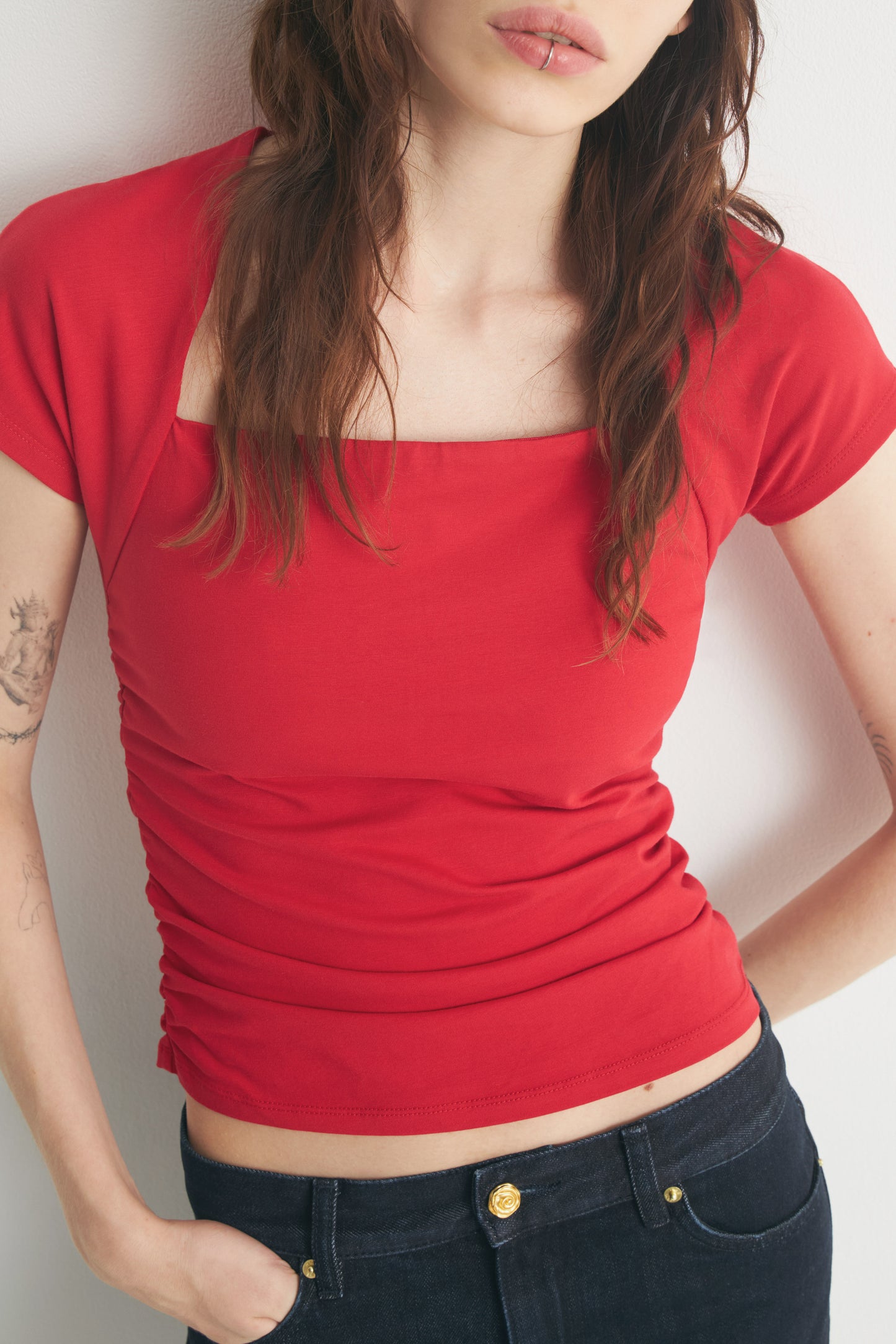 Fitted T-shirt in soft cotton blend jersey with a deep square neckline. Gathered seams on the shoulders and at the sides of waistline for a draped effect.