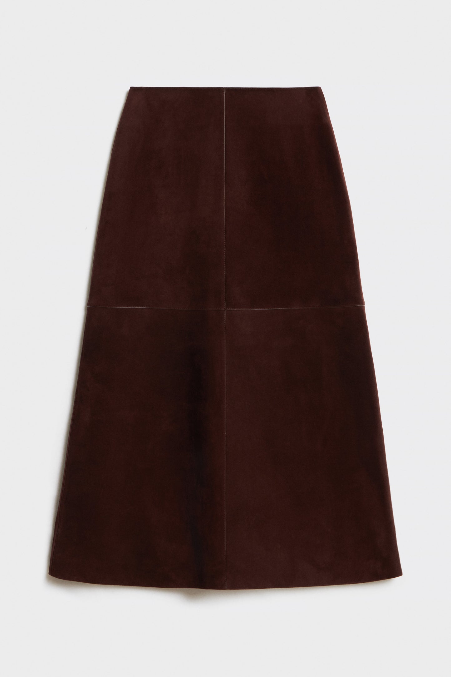Flared midi skirt in soft goat suede. Matching satin lining. Back hidden in-seam vintage-look zip closure.
