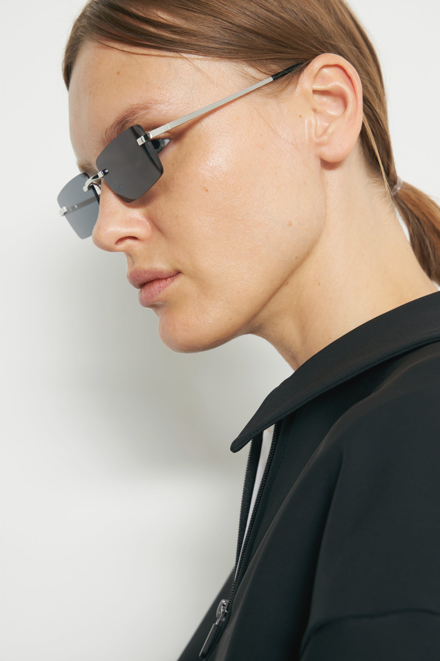 Frameless rectangular sunglasses. Tinted, UV-protective lenses. Case included.