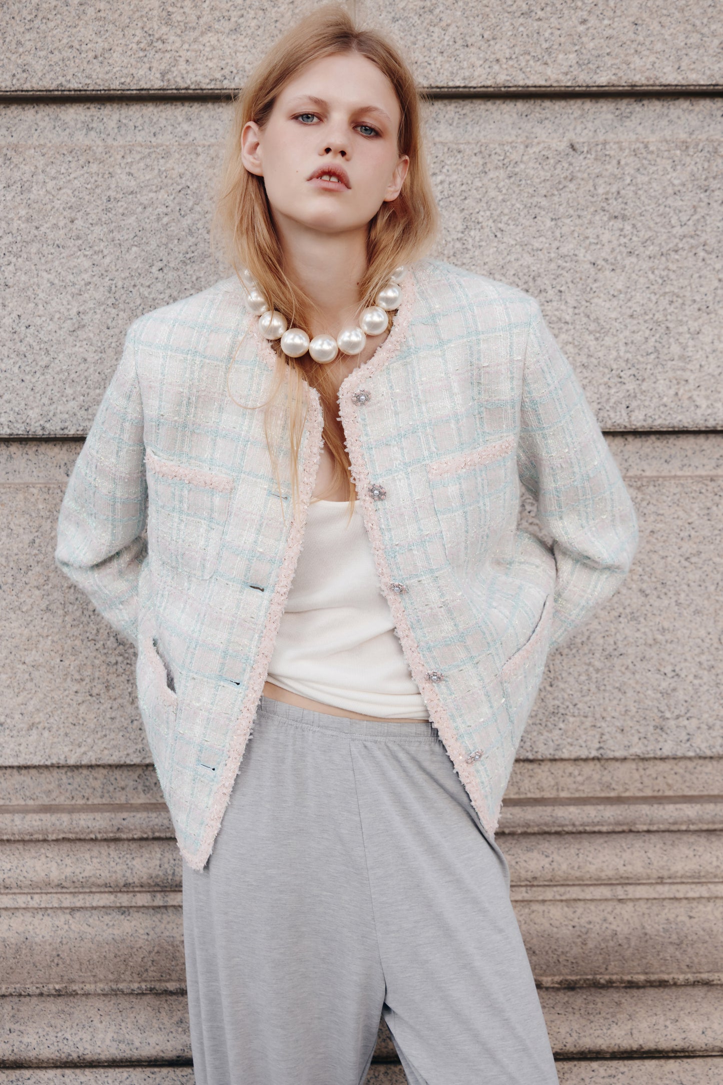 Straight-fit blazer in woven, textured fabric. Round neckline, gold-colored buttons at front, shoulder pads, and a braided edges. Patch chest pockets with button and patch front pockets with button. Lined.