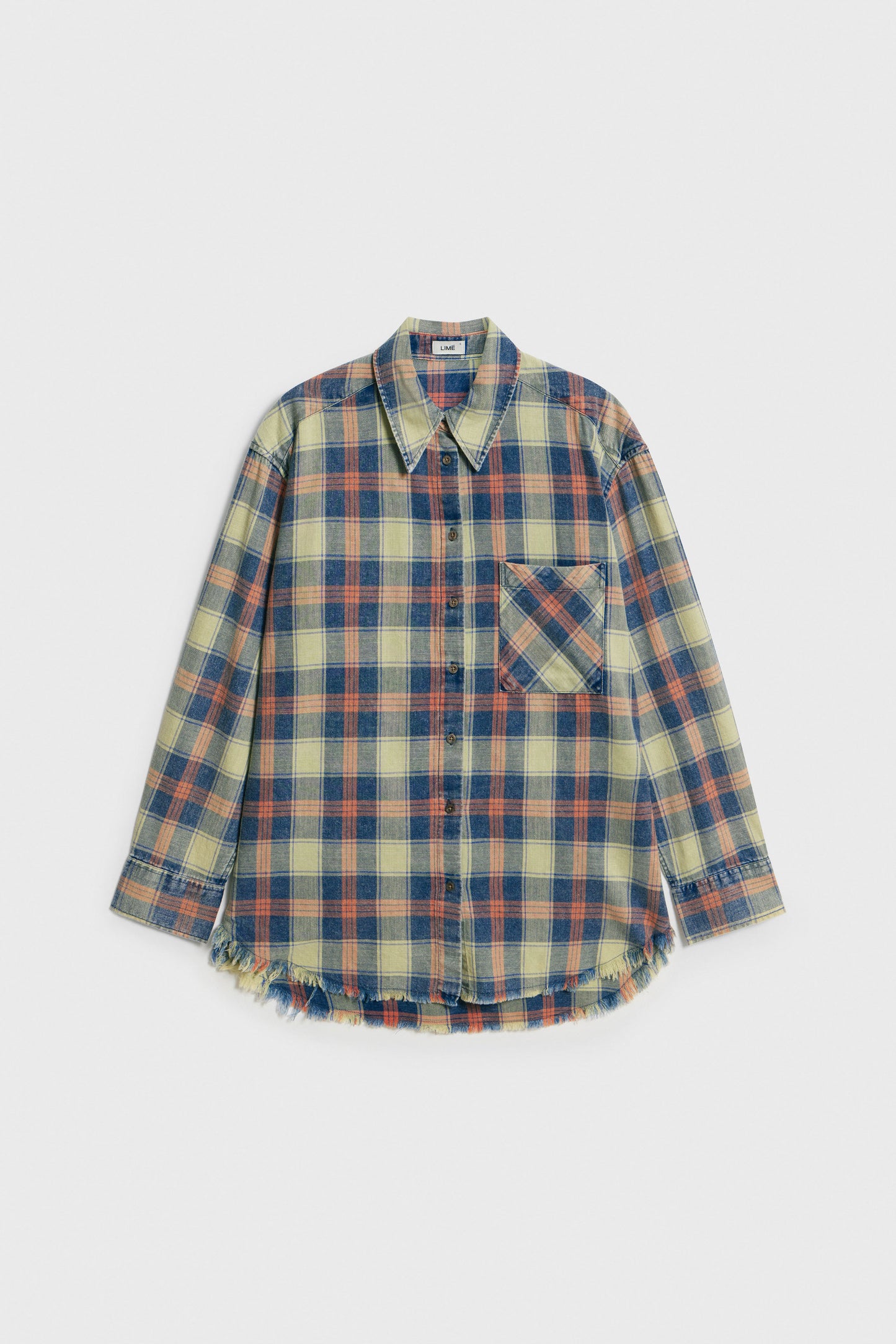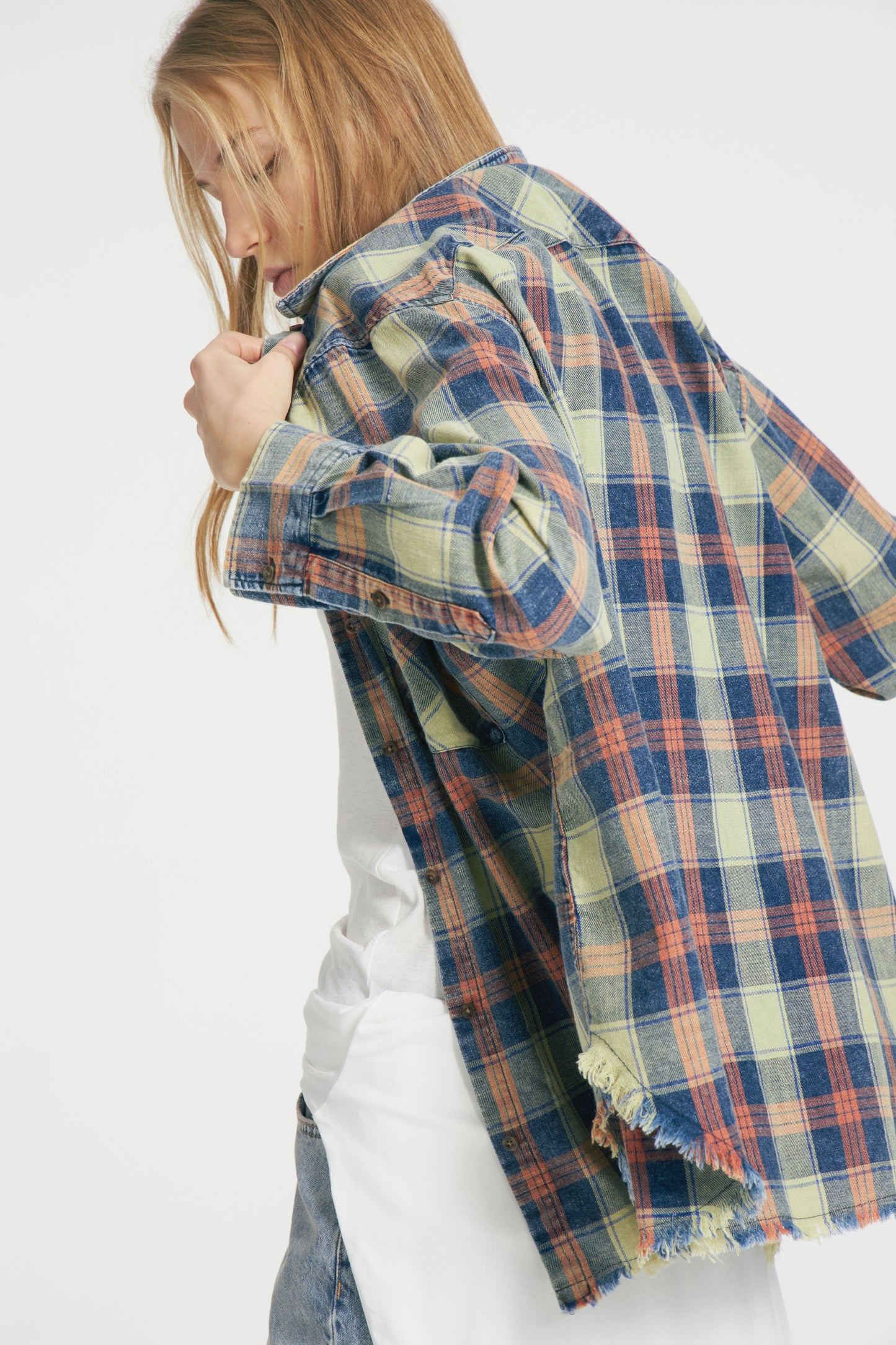 Collared oversize shirt crafted in cotton with a vintage-style raw-cut trim. Chest pocket. Cuffed long sleeves. Rounded hem. Button-up front.