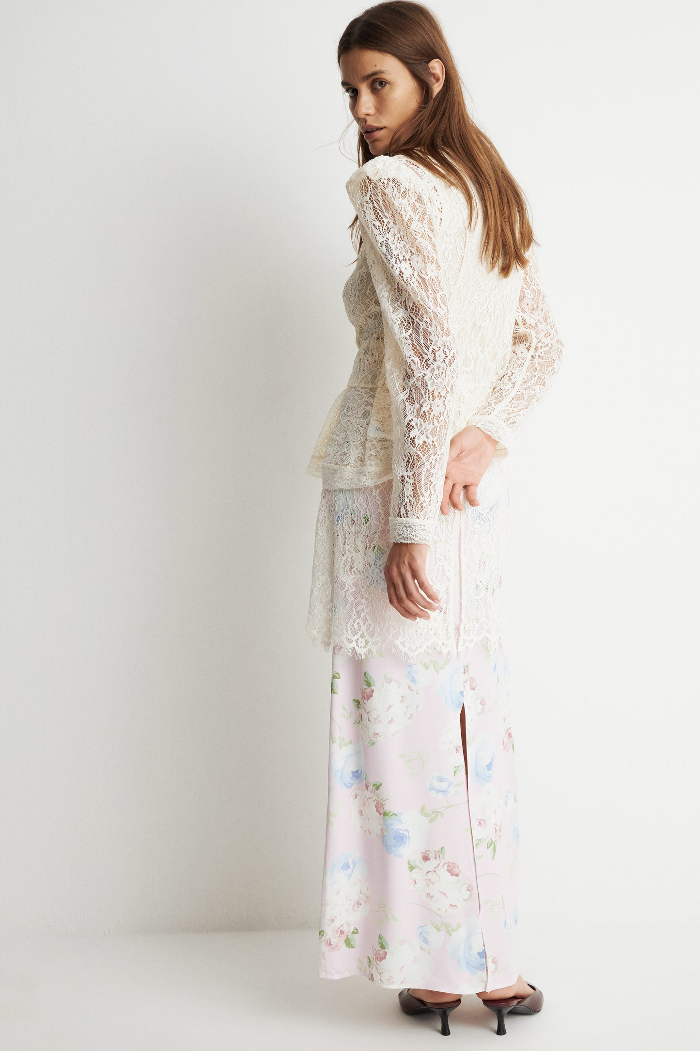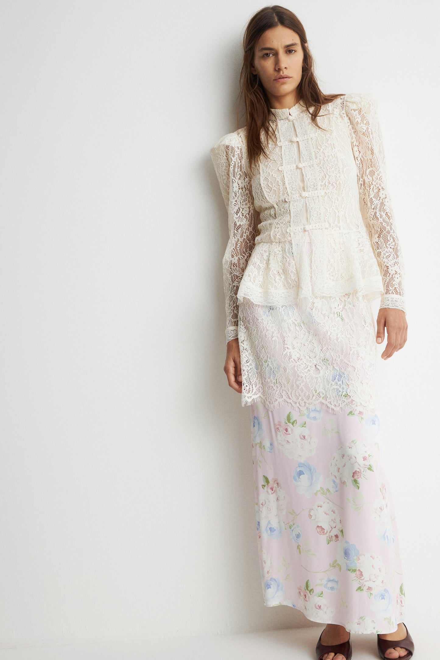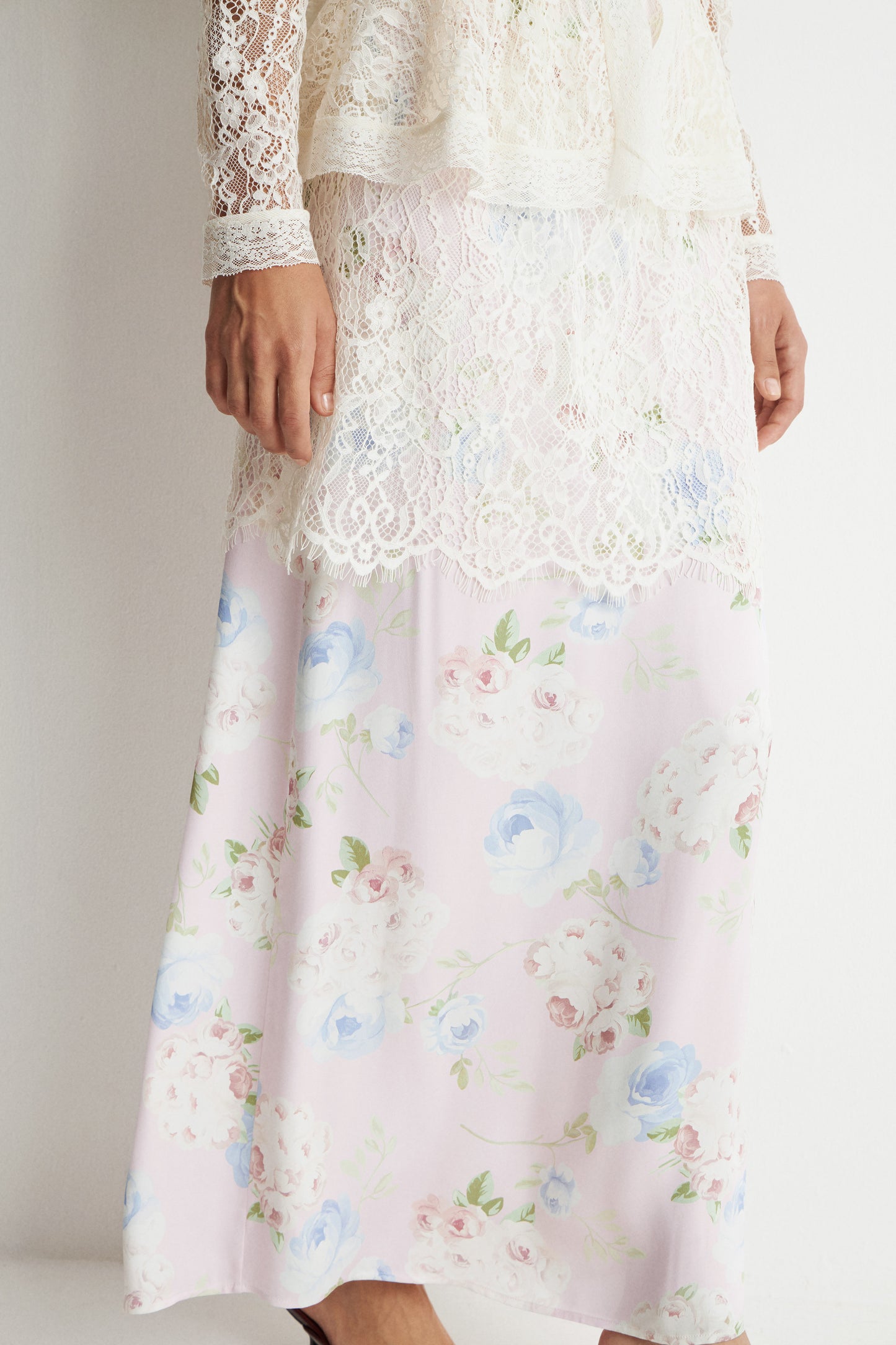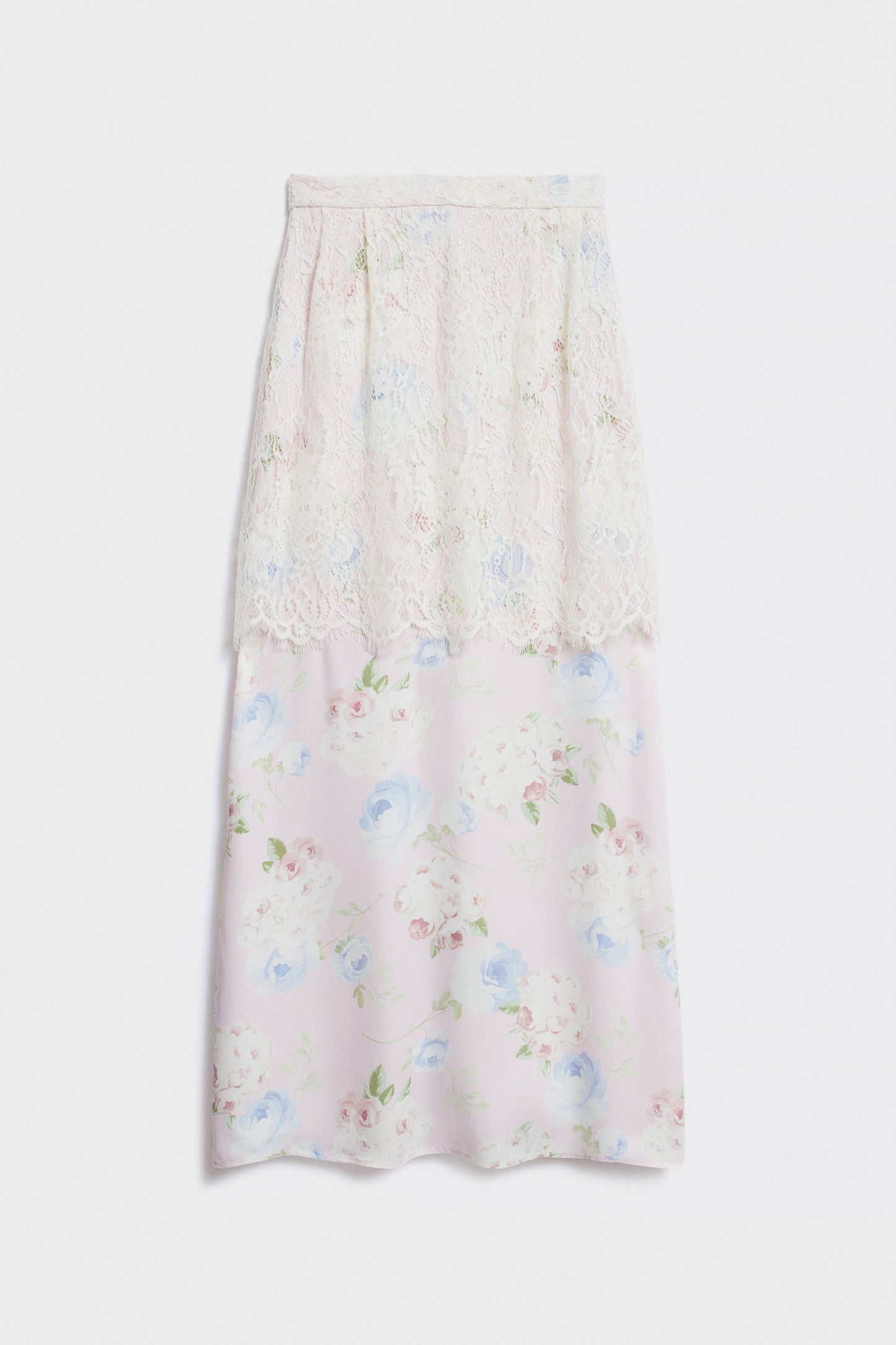 Fitted, maxi-length skirt in a viscose and lace features a floral pattern. A concealed zip and hook at the back.