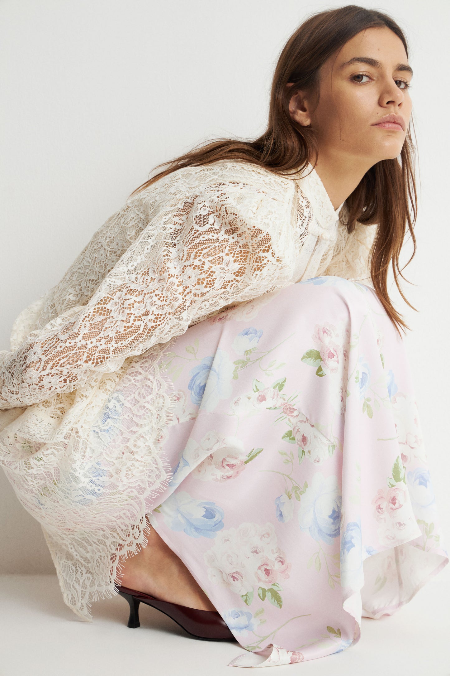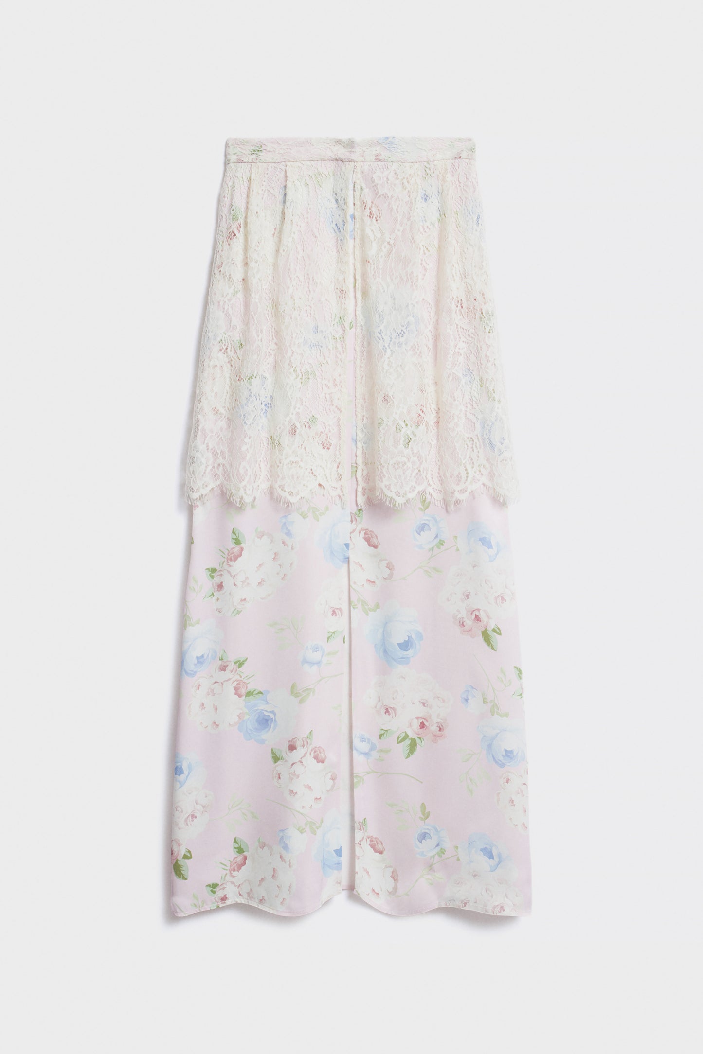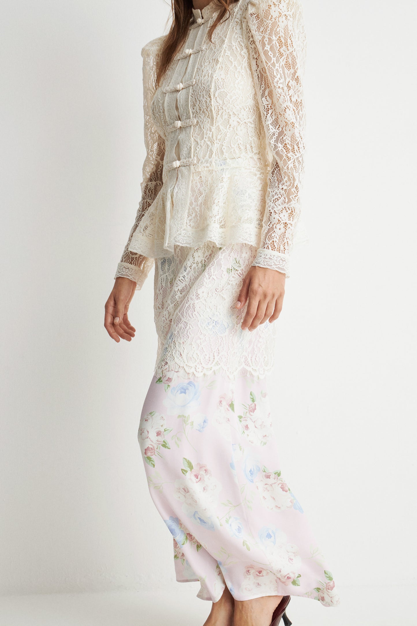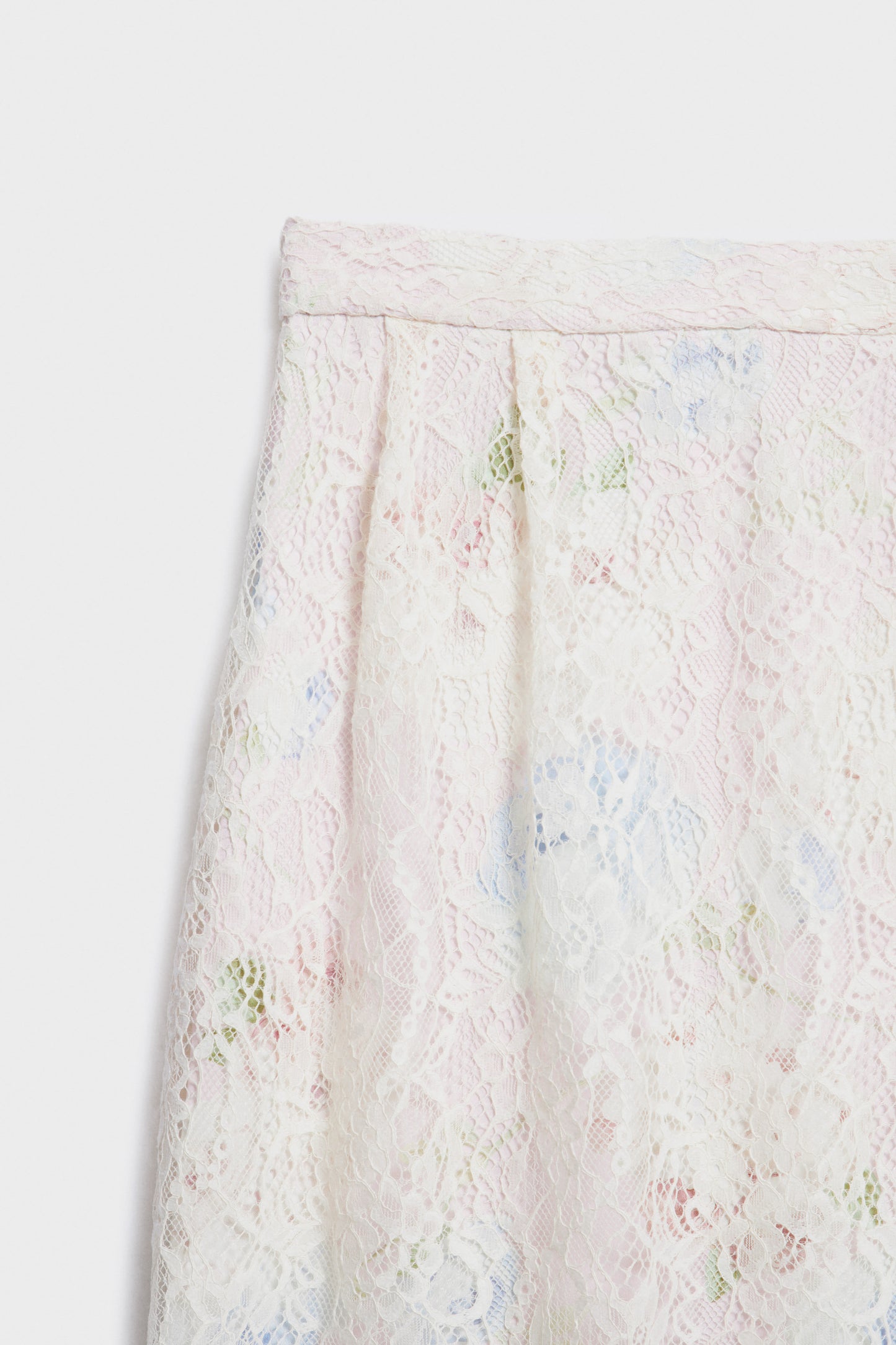 Fitted, maxi-length skirt in a viscose and lace features a floral pattern. A concealed zip and hook at the back.