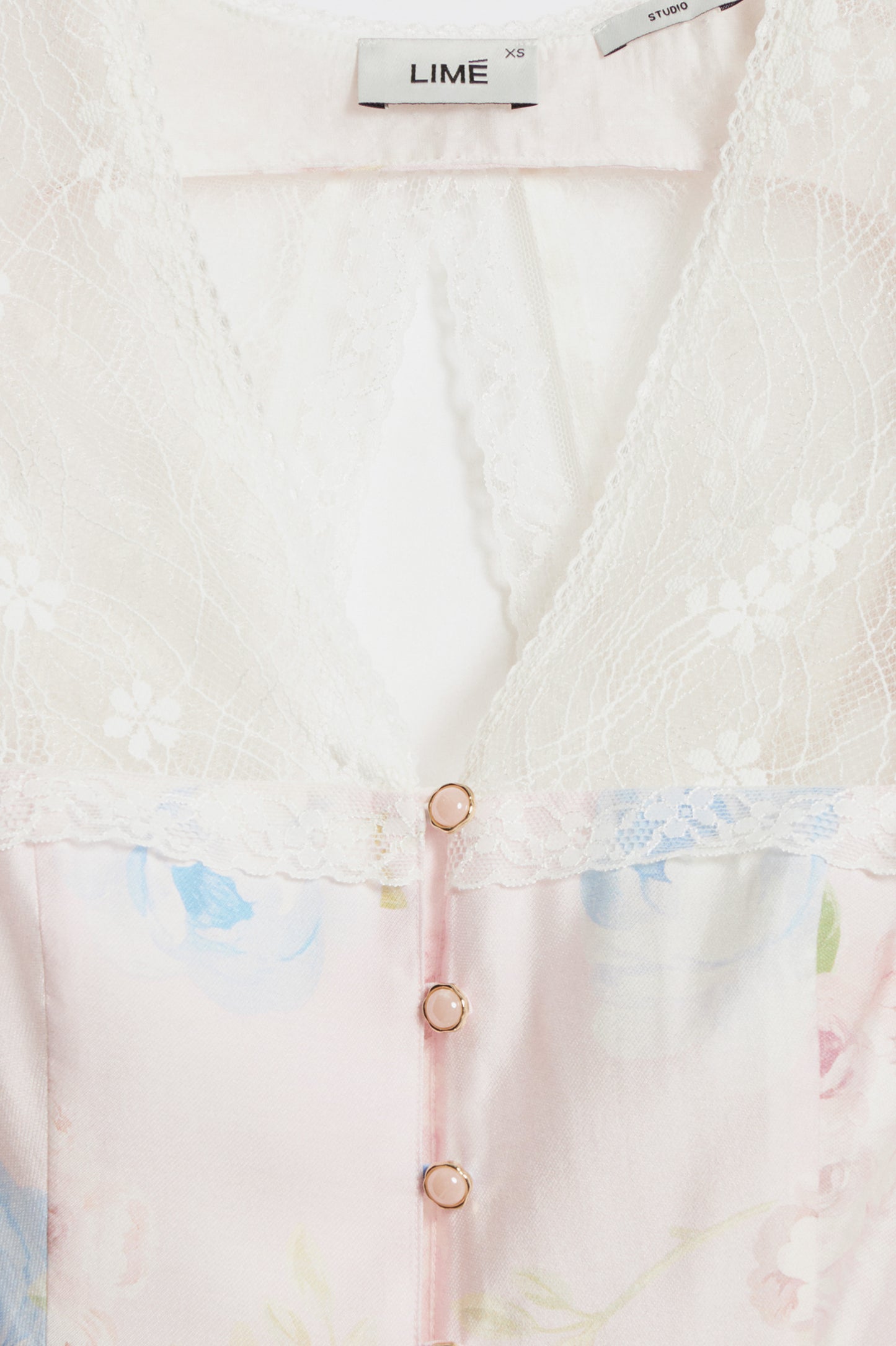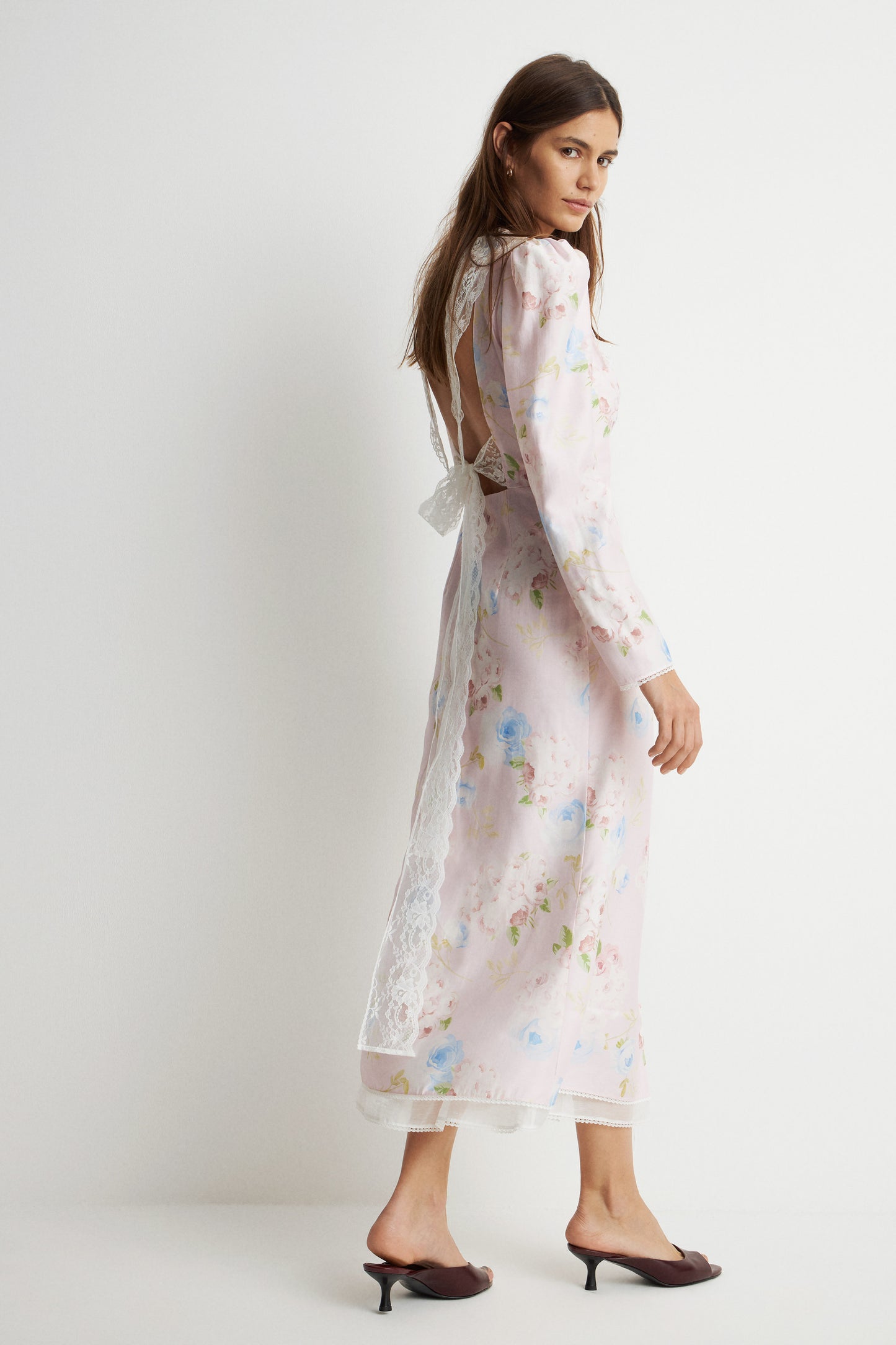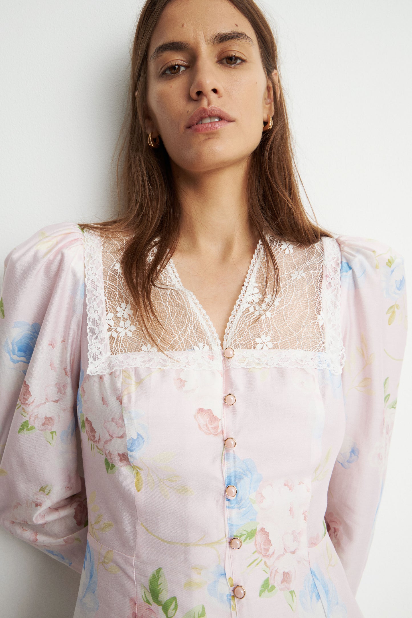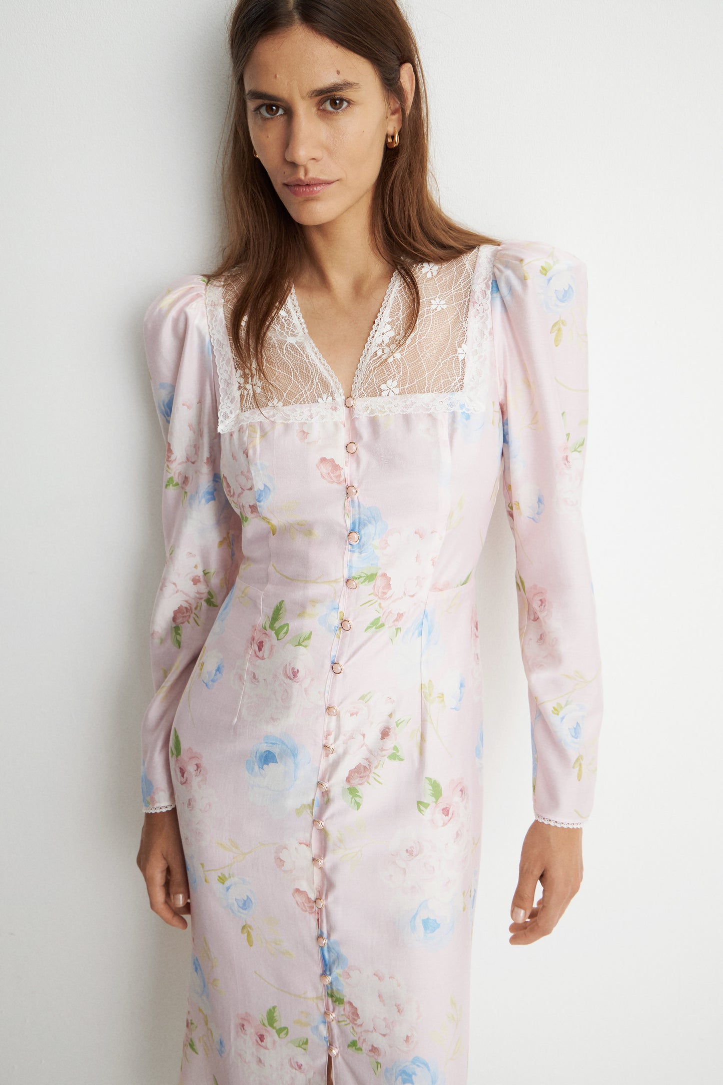 Lace-trimmed dress in a viscose blend containing some wool featuring a floral print. Peter Pan collar, voluminous long sleeves, two sets of ties at the back and metal buttons down the front. Lining.