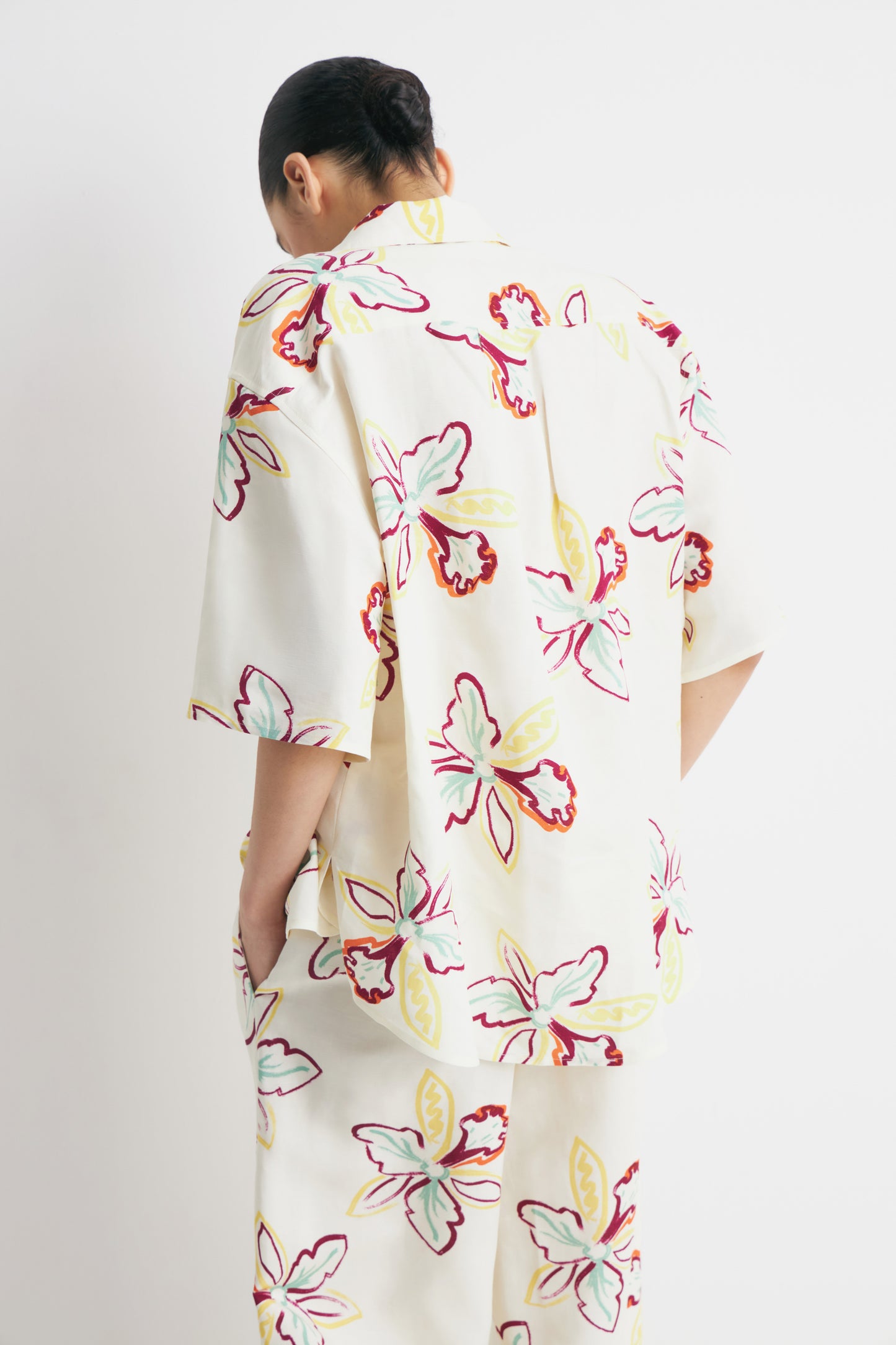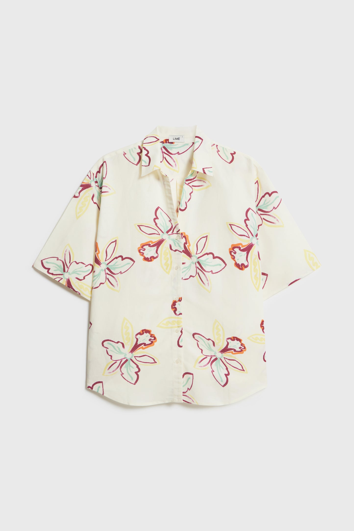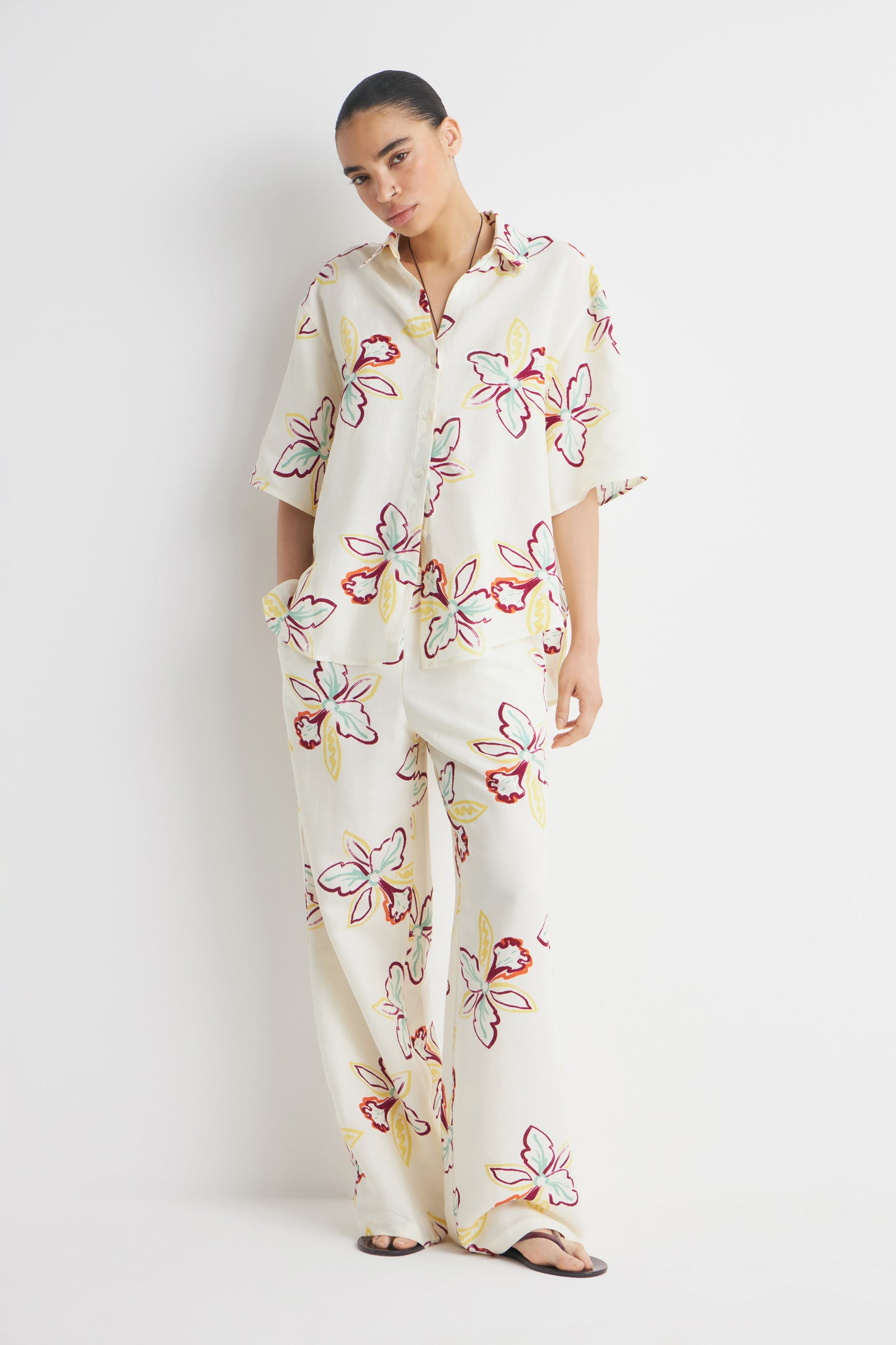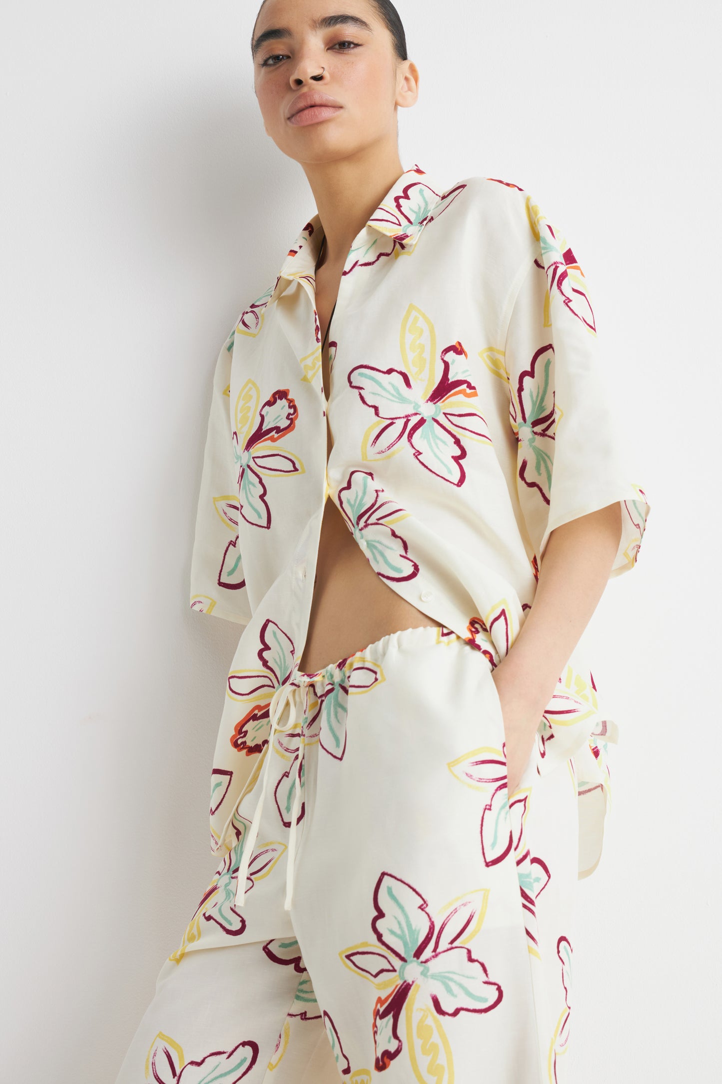 Straight-fit shirt in soft viscose and linen weave with a printed design. Collar, buttons at the front, and short sleeves. Gently curved hem with side slits.