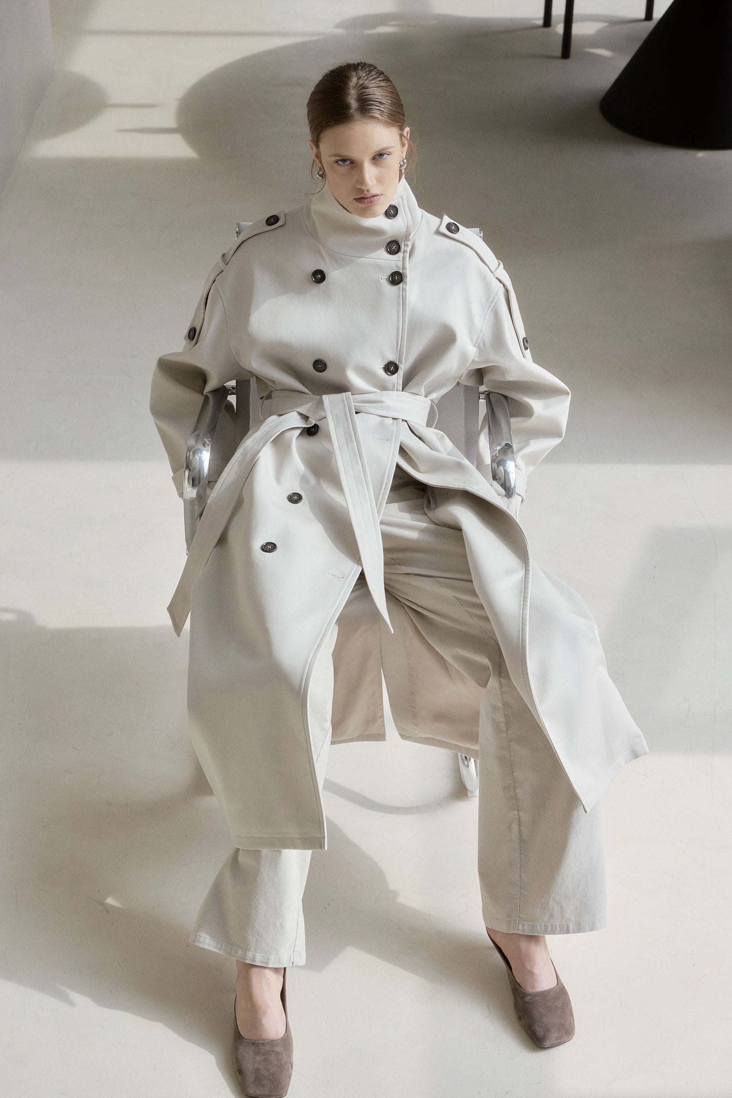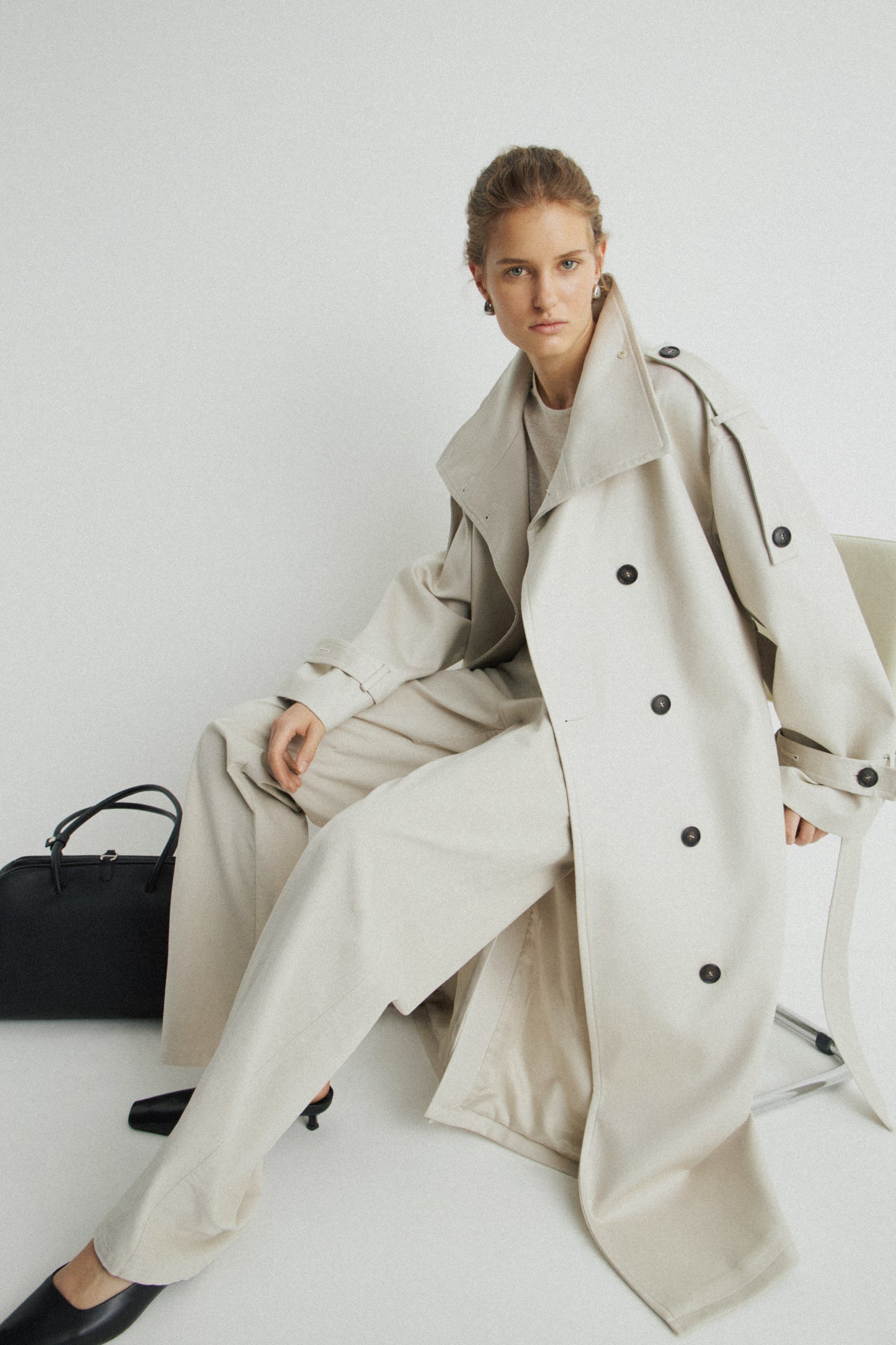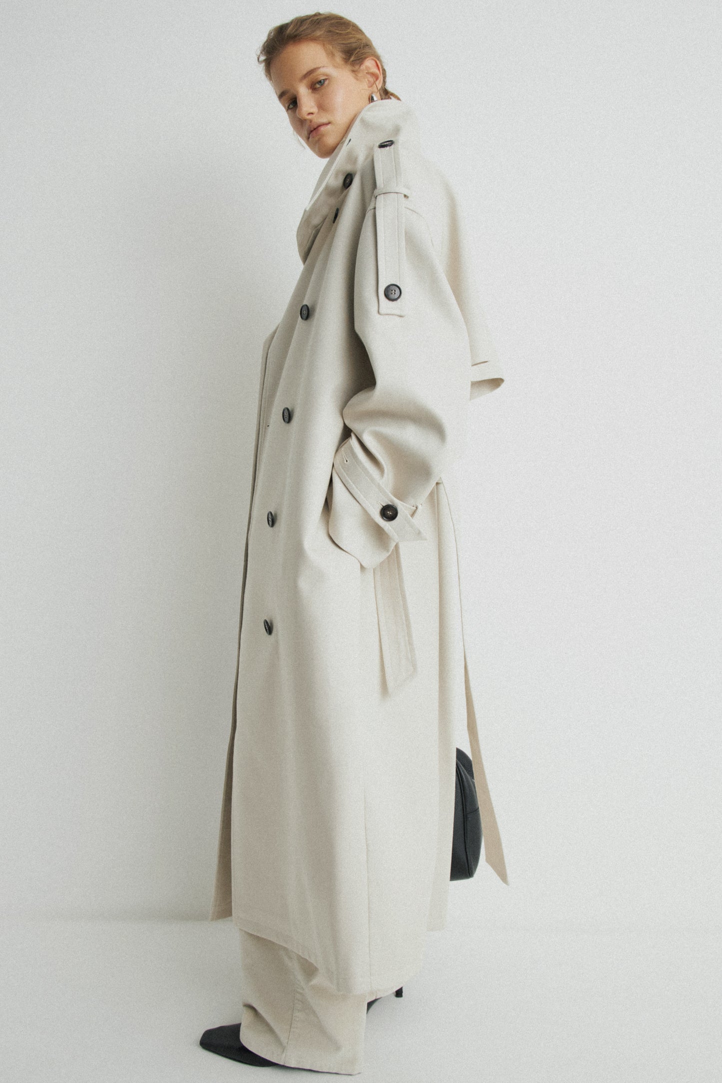 Long, loose-fit, double-breasted trench coat in cotton twill with a water-repellent coating. High collar with buttons. Buttons at front, side pockets, and a wide belt at the waist. Epaulets with button, and long sleeves with adjustable tab at cuffs. Lined with satin viscose.