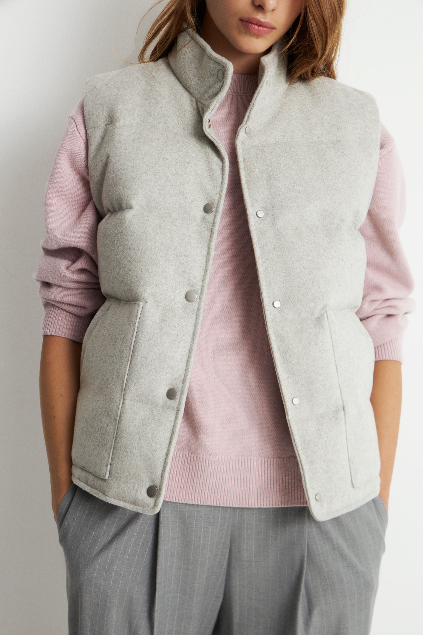 Regular fit quilted vest made of water-repellent fabric with 51% wool. High collar and sleeveless. Deep patch pockets at the hip and inner pocket detail. Interior filled with a mix of feather and down. Lined. Front snap-button closure. Keep you warm when the temperature < +5℃