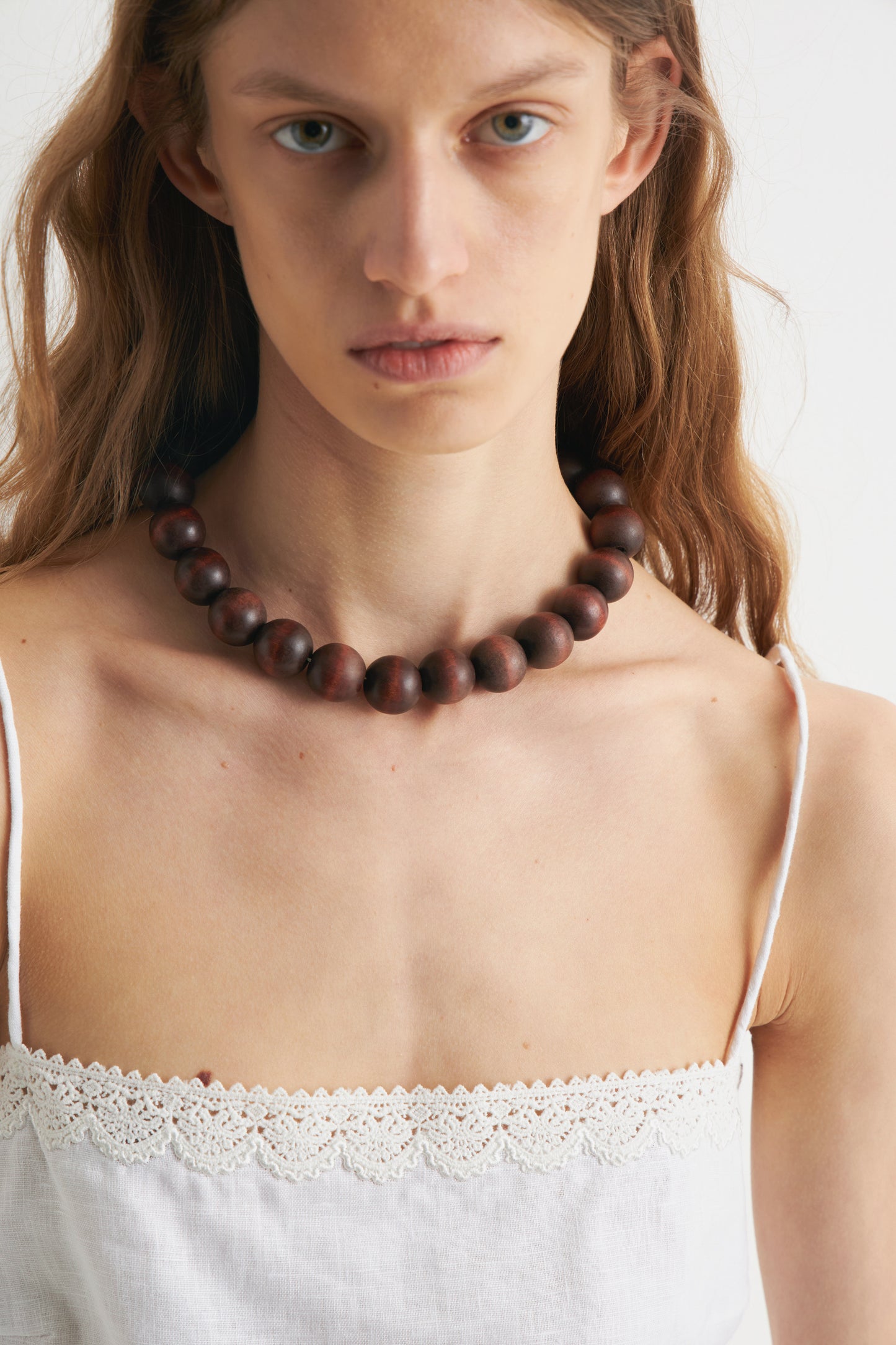 Short wood bead necklace. Magnetic closure. ONE SIZE: 44 cm