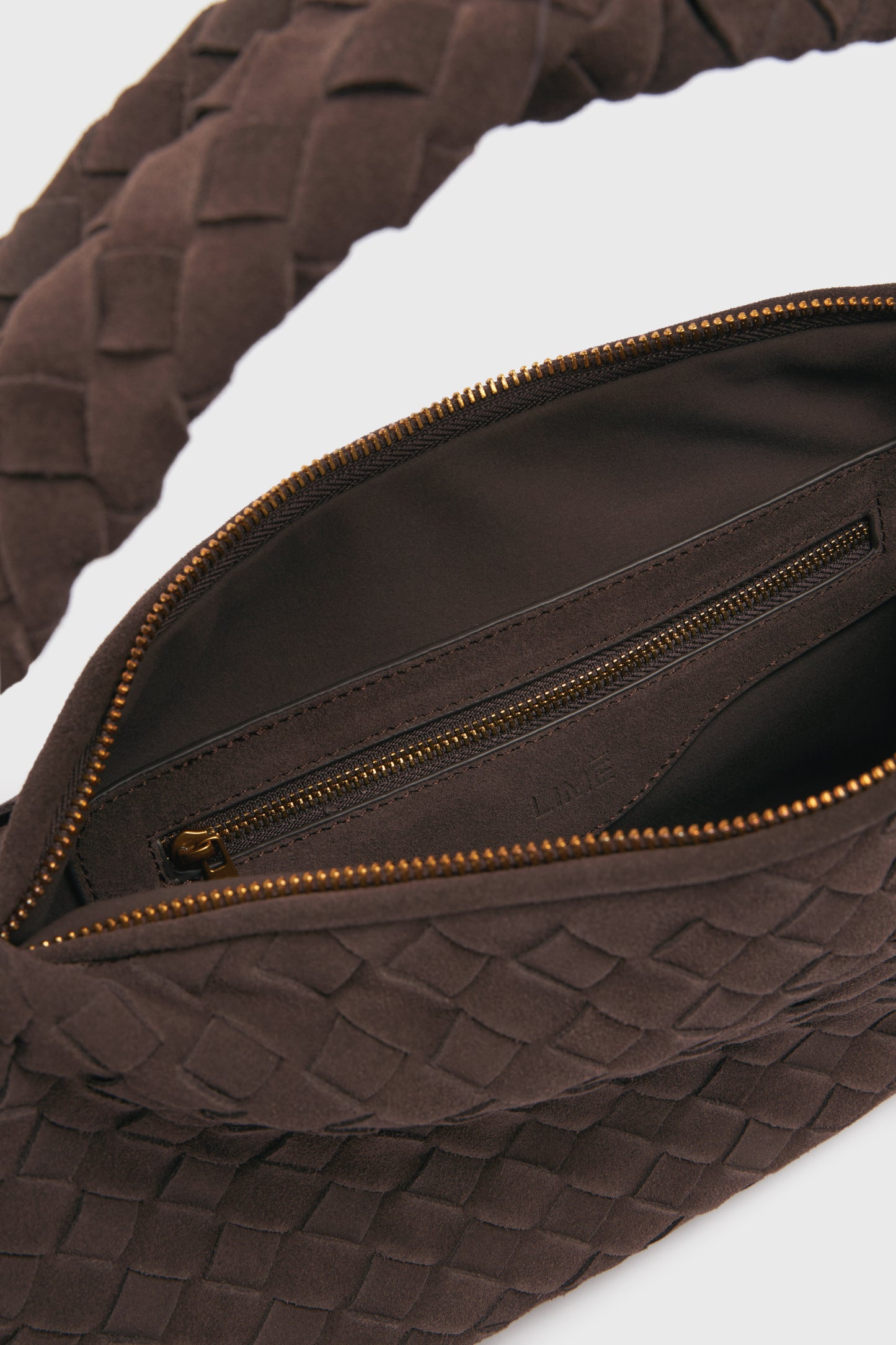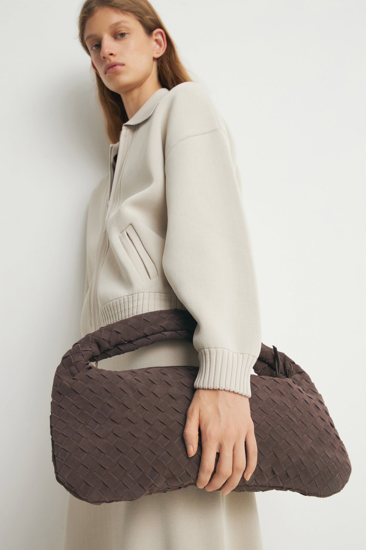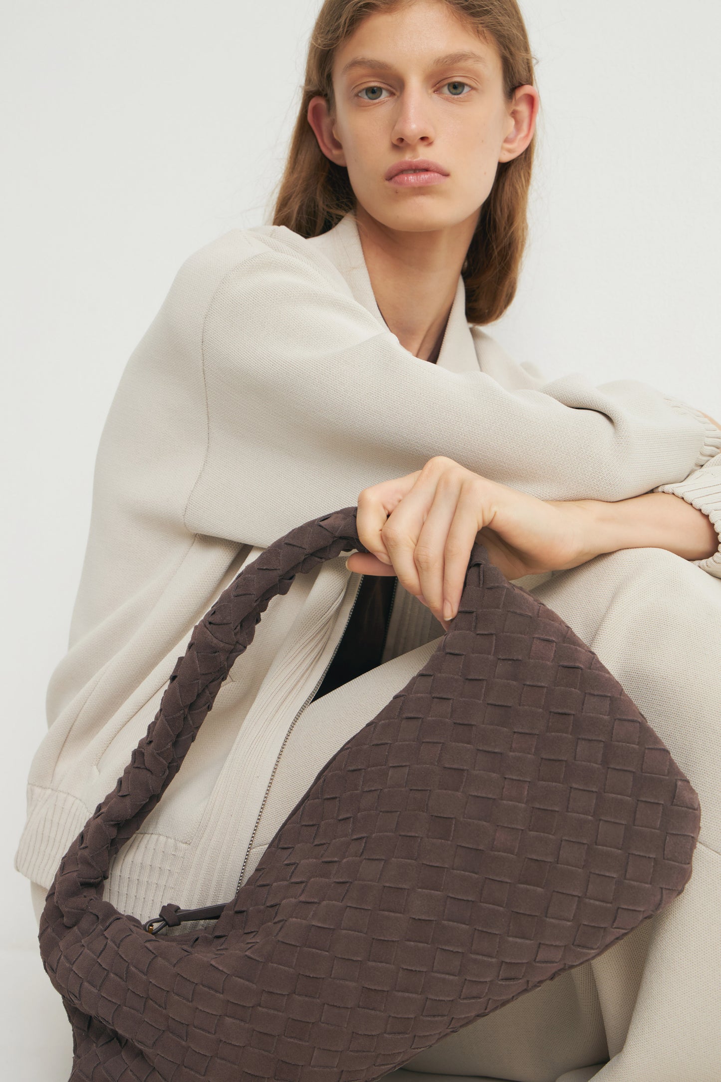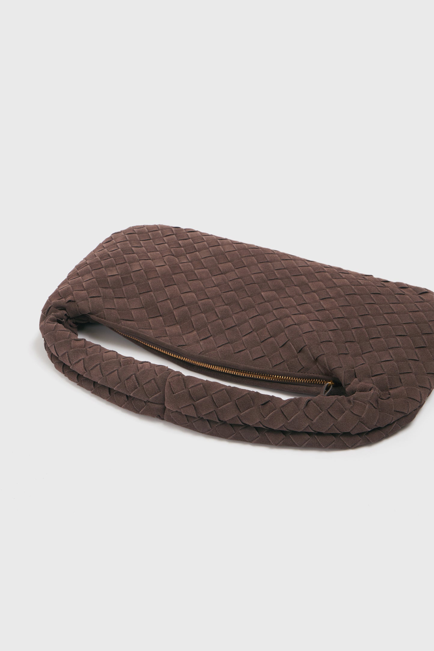 Casual bag intricately braided from suede strips of fabric that form an enlarged checked pattern. Styled with one inner compartment and small zipped pocket. Shoulder strap. Lining. Zip closure. Size: 46 x 2,5 x 22 cm (length x width x height).